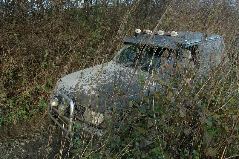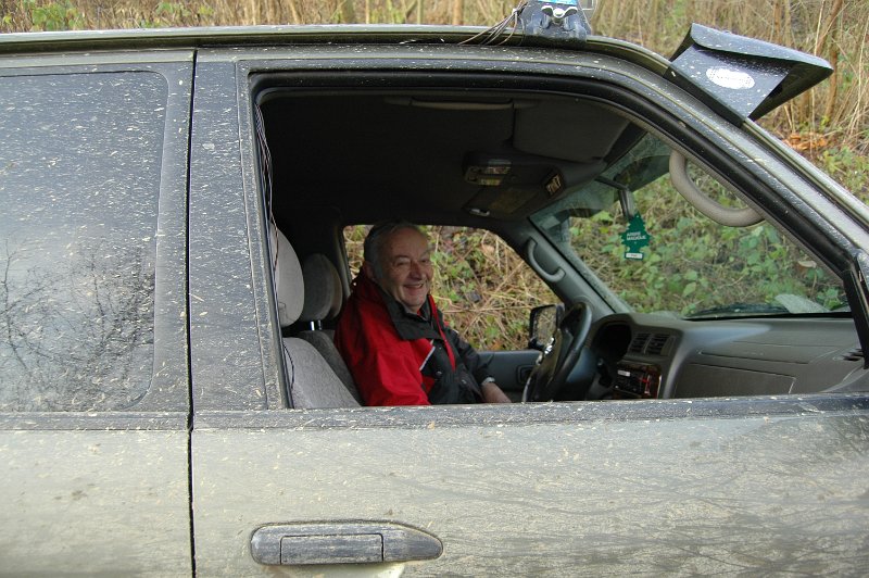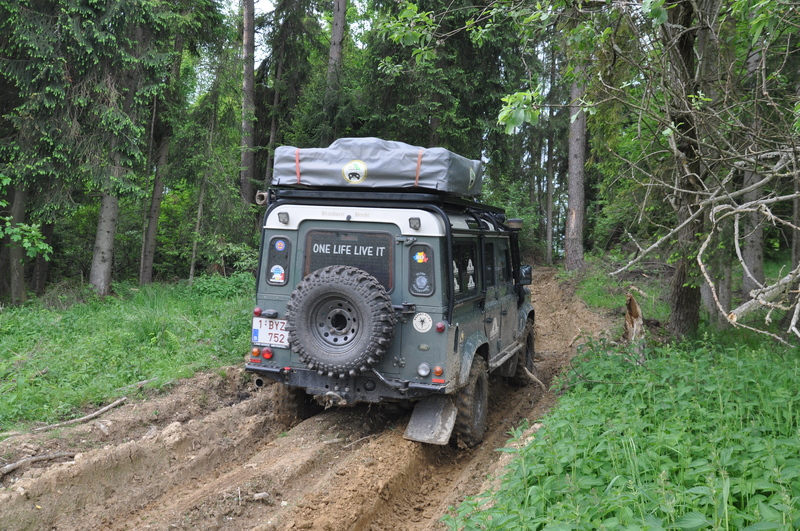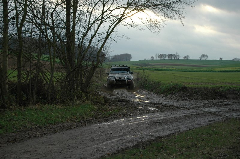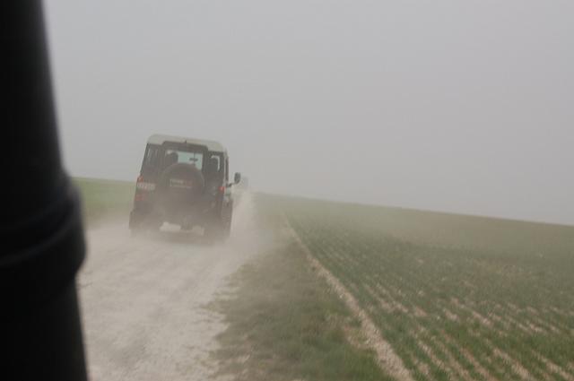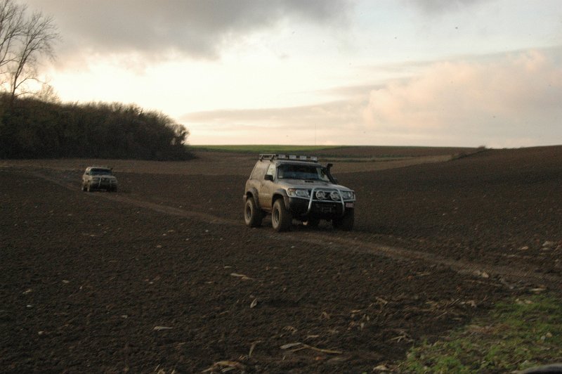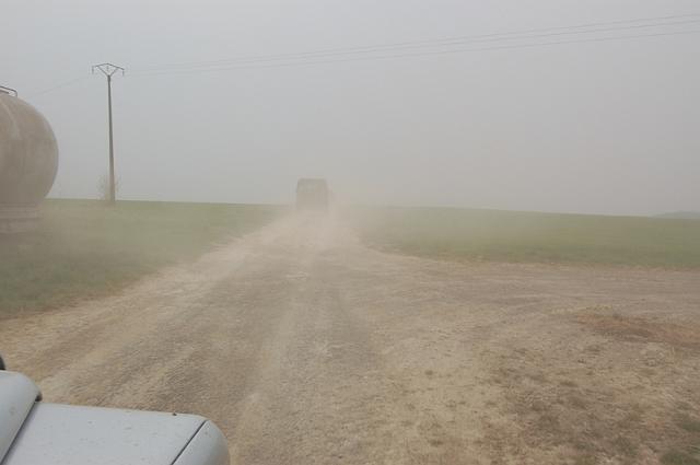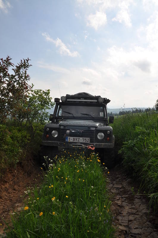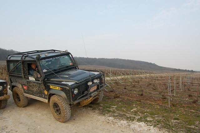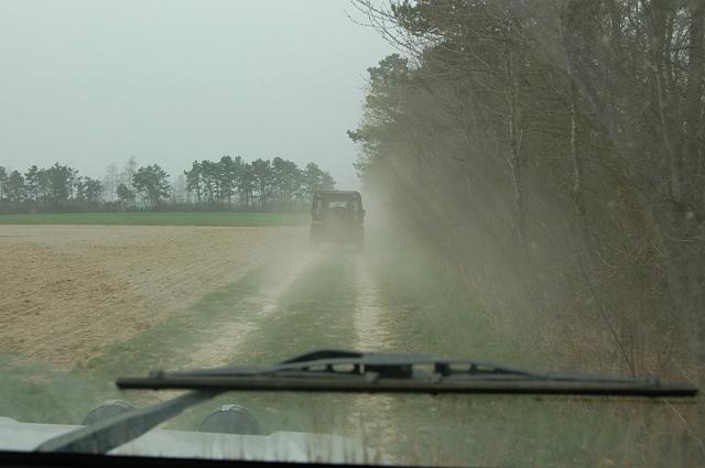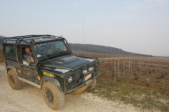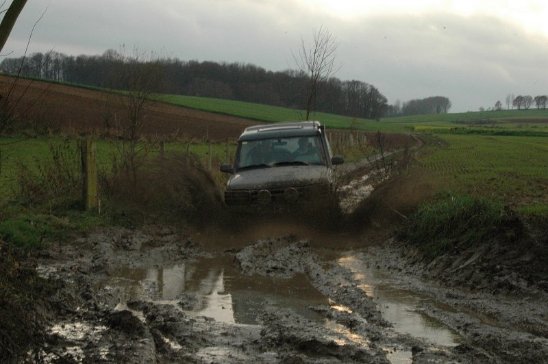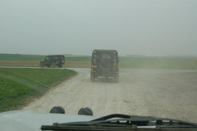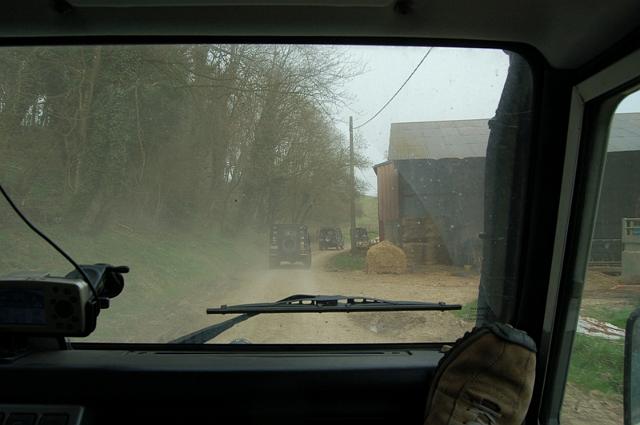 We vertrekken aan het benzine-station op de E40 waar we direct de velden intrekken. Door recente regen zijn de wegen modderig en het duurt dan ook niet lang voor de wagens onherkenbaar de streek doorkuisen.