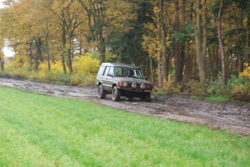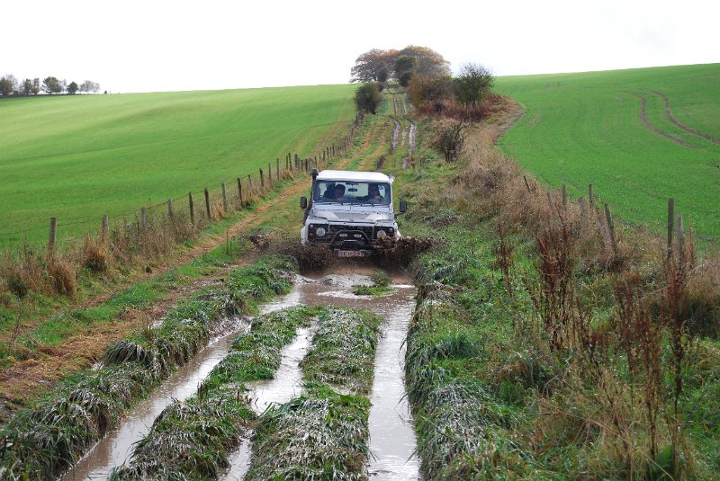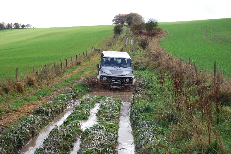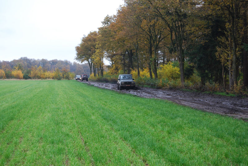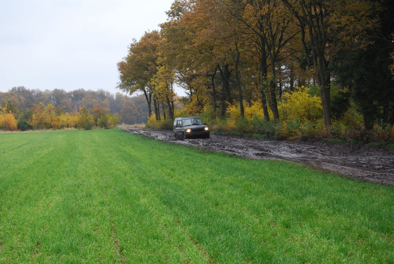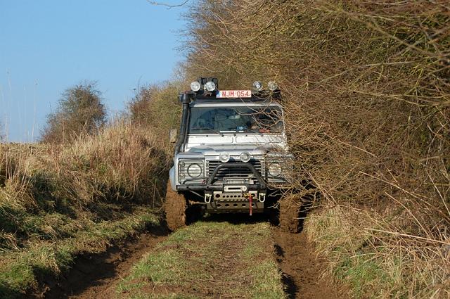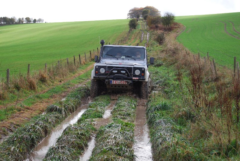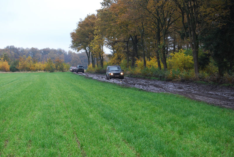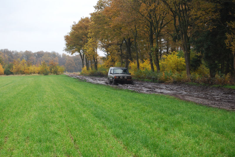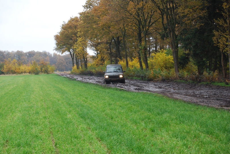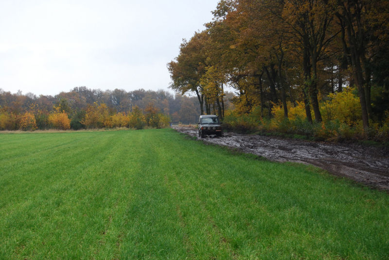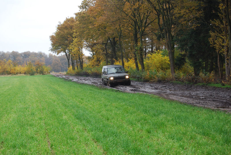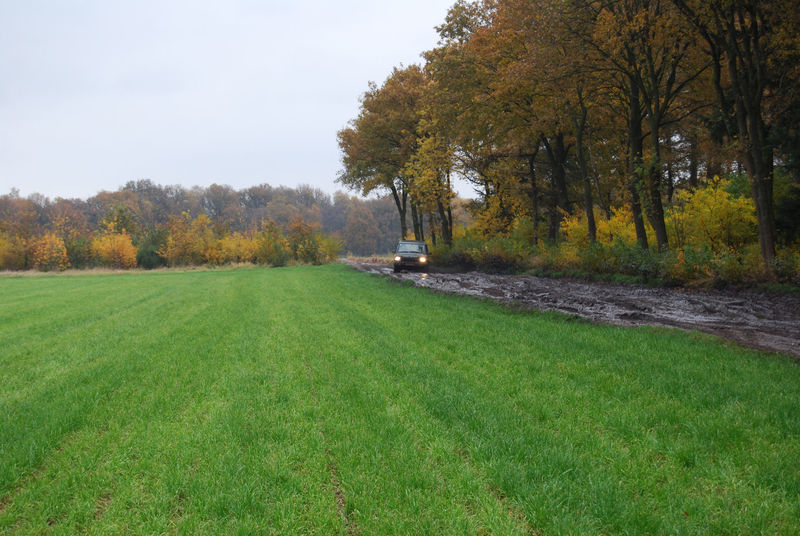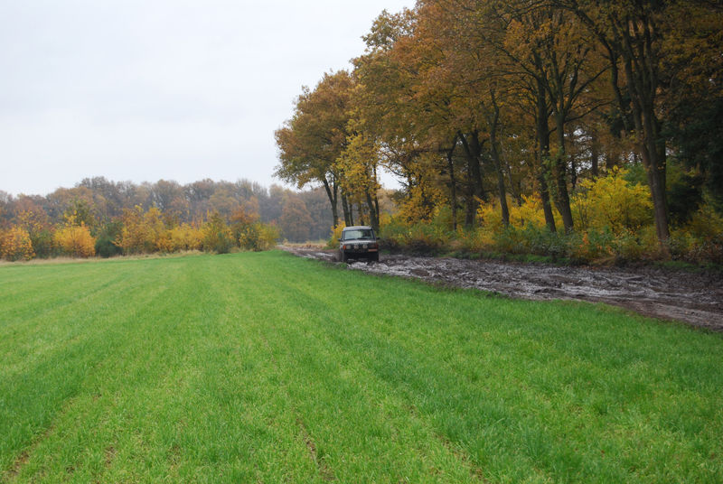 Na de doorwading gaat het verder via bossen en velden. Krasvrij is de rit zeker niet maar het is ook geen wagenbreker. Bij het stukje extreme is de Def90 in staat de bocht te nemen maar door de roofrack in combinatie terug met een lange body, blijft de Disco2 hangen in de bomen en moet ik terugdraaien. Wel eens leuk om te proberen. Het gaat nu verder richting einde en een van de laatste stukken is een grasstrook tussen twee velden. Makkie dus ..... dachten we.
