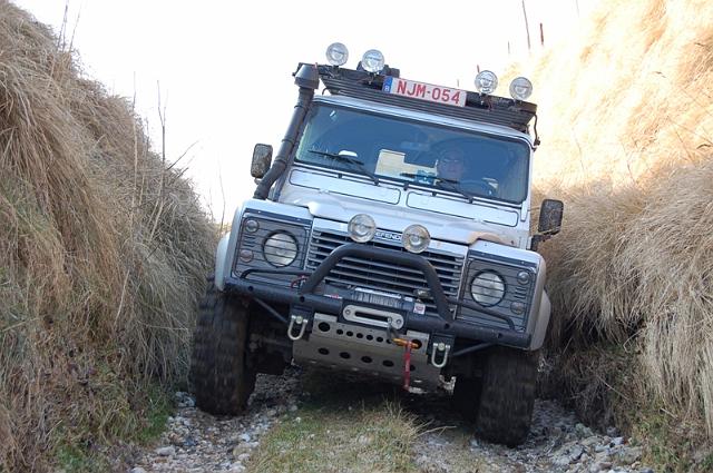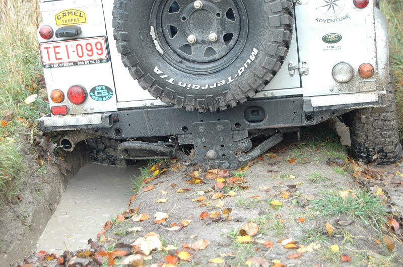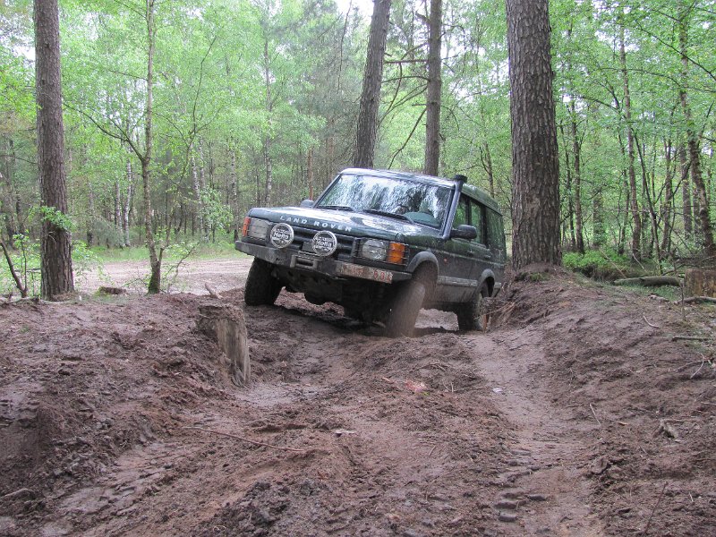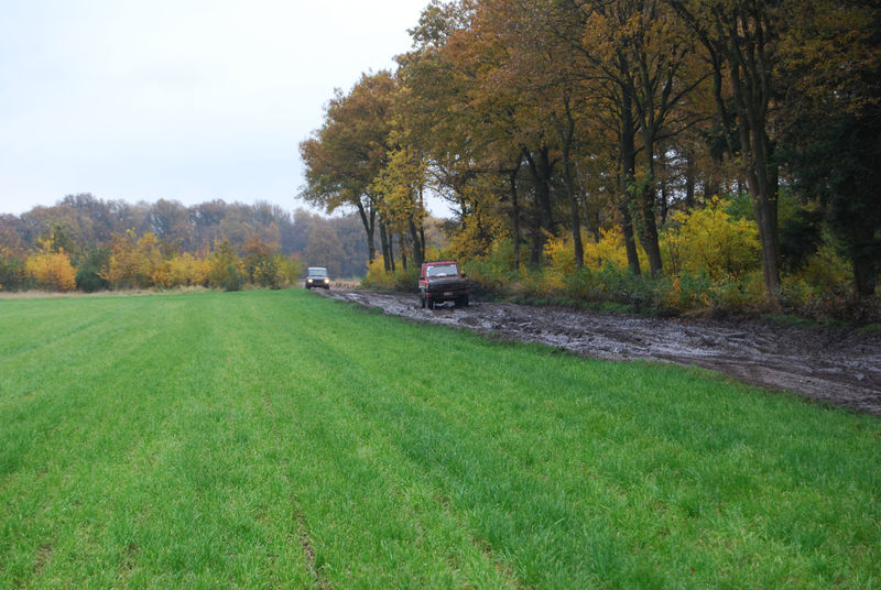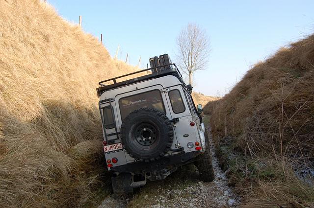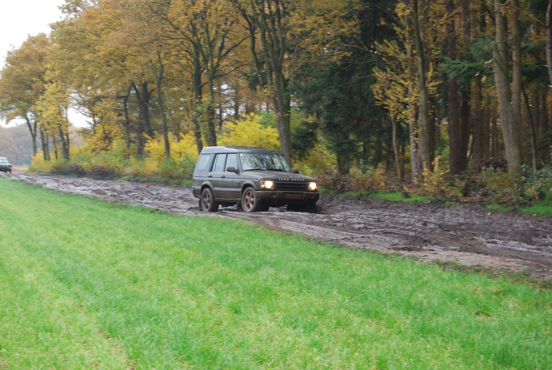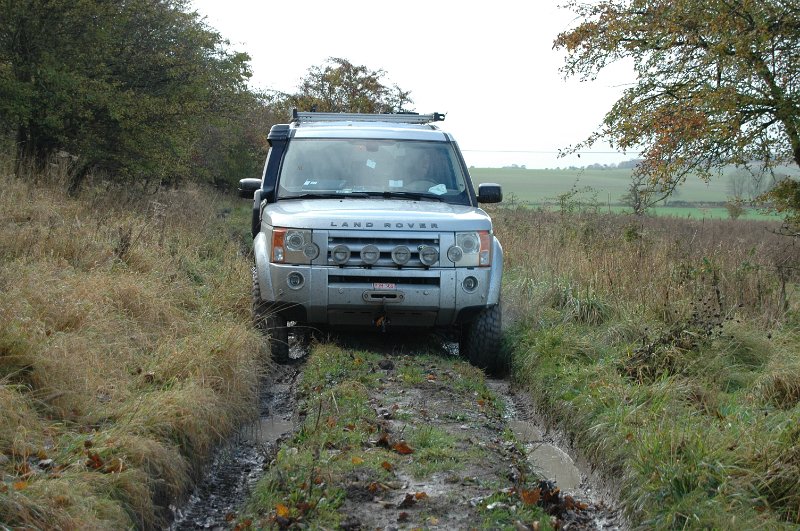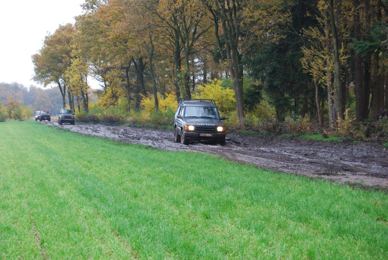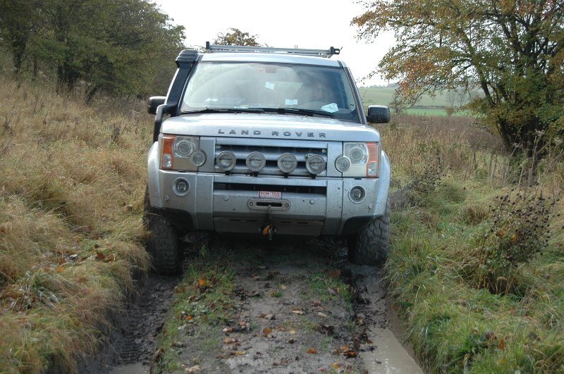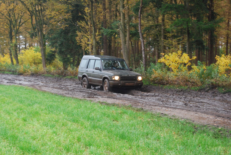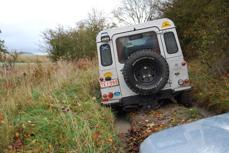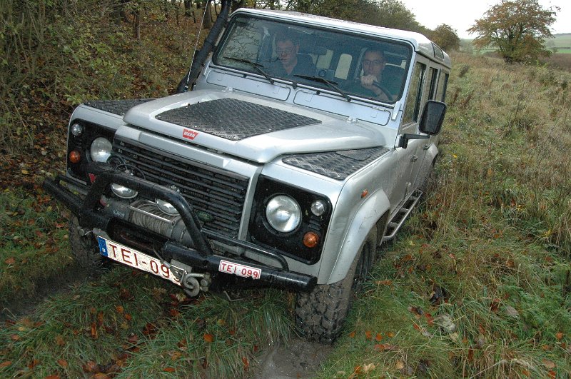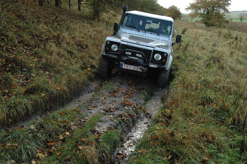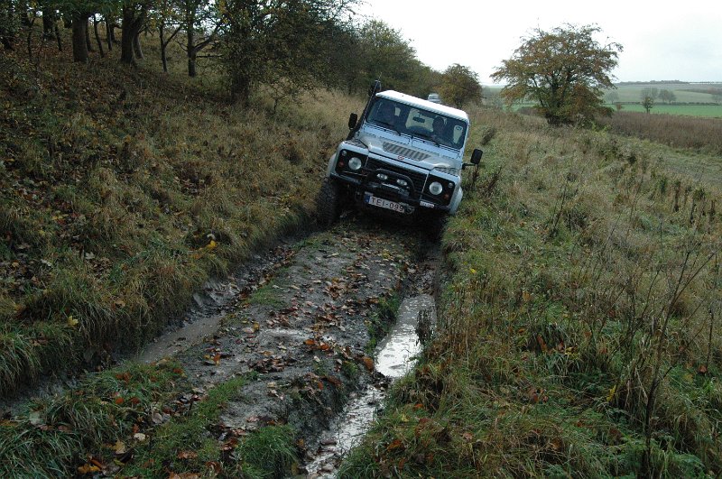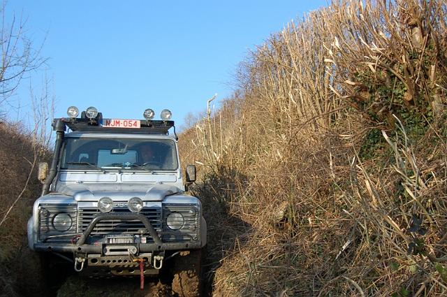 Na de doorwading gaat het verder via bossen en velden. Krasvrij is de rit zeker niet maar het is ook geen wagenbreker. Bij het stukje extreme is de Def90 in staat de bocht te nemen maar door de roofrack in combinatie terug met een lange body, blijft de Disco2 hangen in de bomen en moet ik terugdraaien. Wel eens leuk om te proberen. Het gaat nu verder richting einde en een van de laatste stukken is een grasstrook tussen twee velden. Makkie dus ..... dachten we.