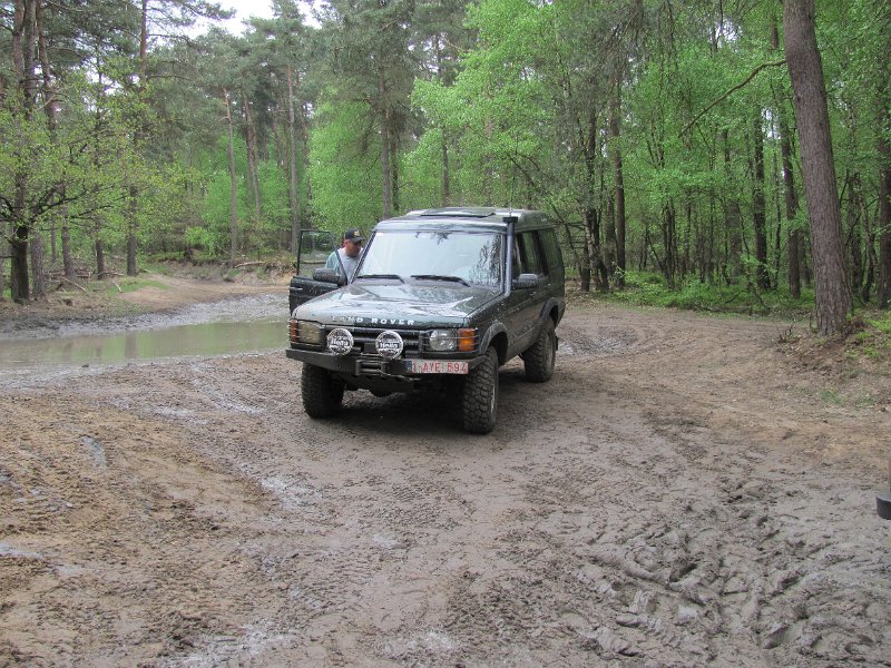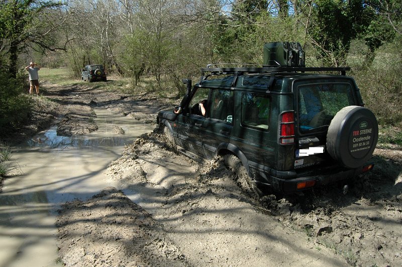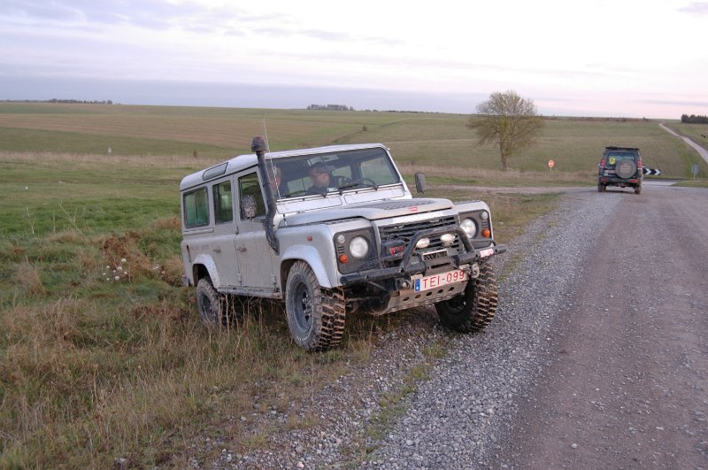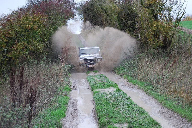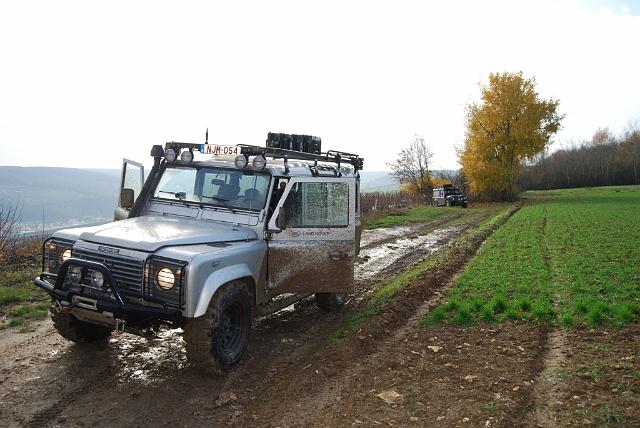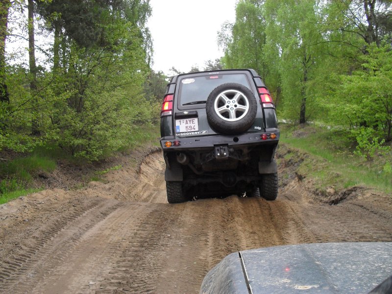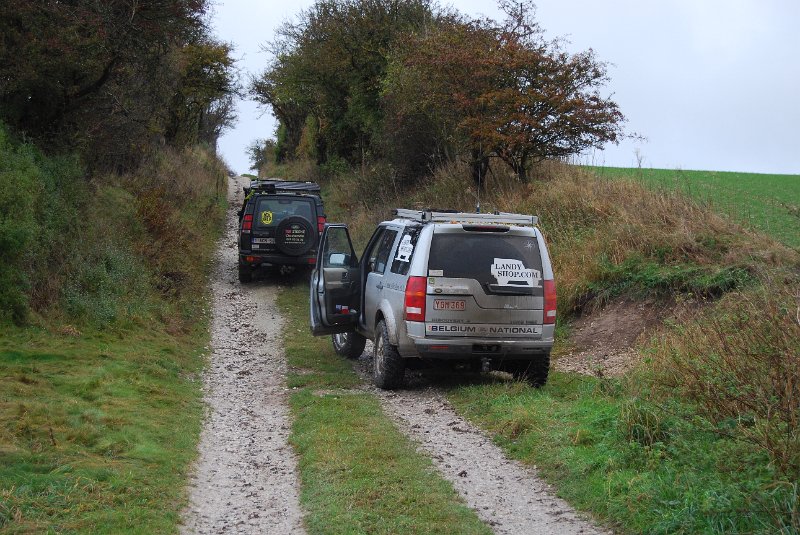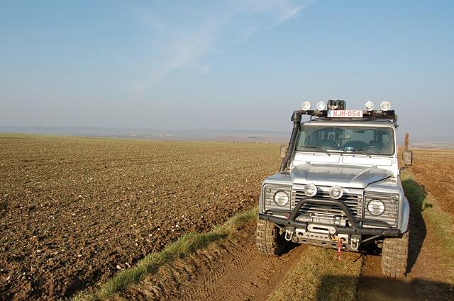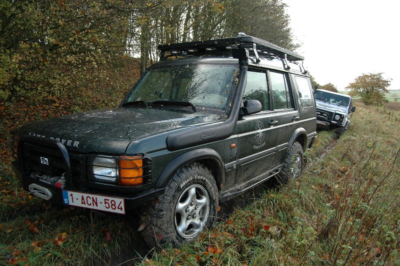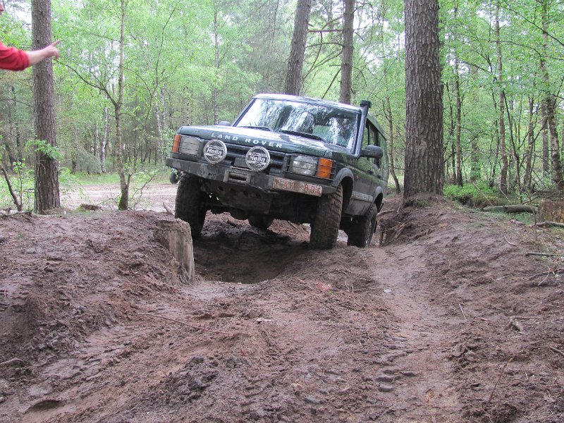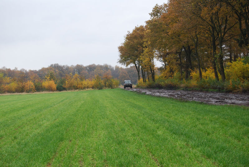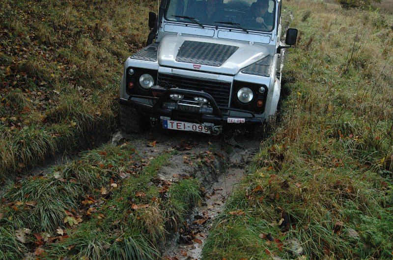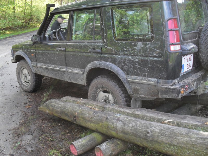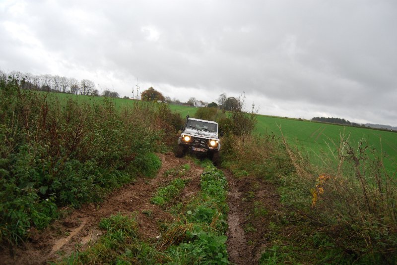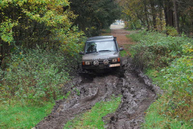 Na de doorwading gaat het verder via bossen en velden. Krasvrij is de rit zeker niet maar het is ook geen wagenbreker. Bij het stukje extreme is de Def90 in staat de bocht te nemen maar door de roofrack in combinatie terug met een lange body, blijft de Disco2 hangen in de bomen en moet ik terugdraaien. Wel eens leuk om te proberen. Het gaat nu verder richting einde en een van de laatste stukken is een grasstrook tussen twee velden. Makkie dus ..... dachten we.