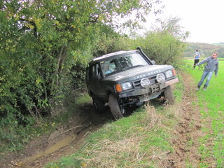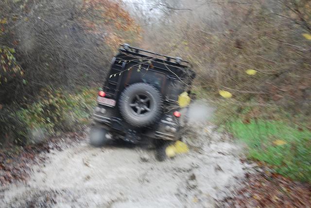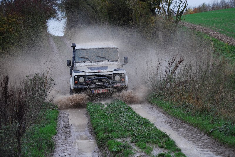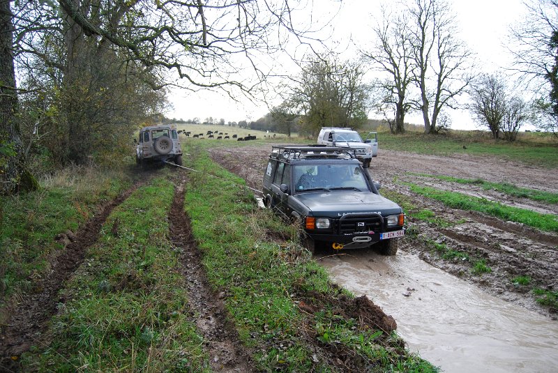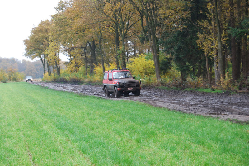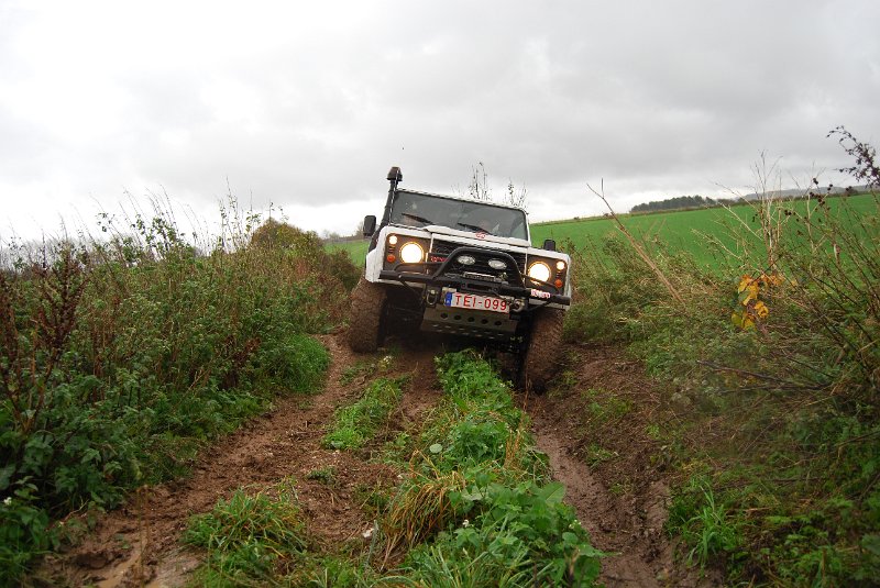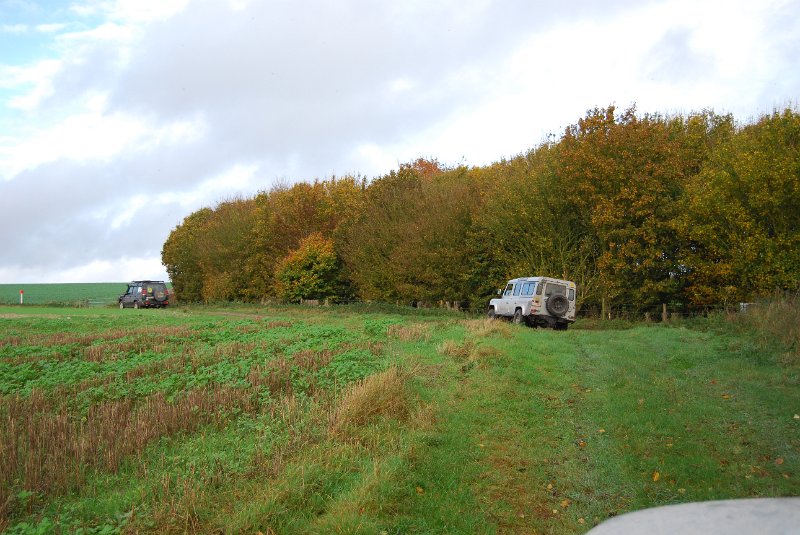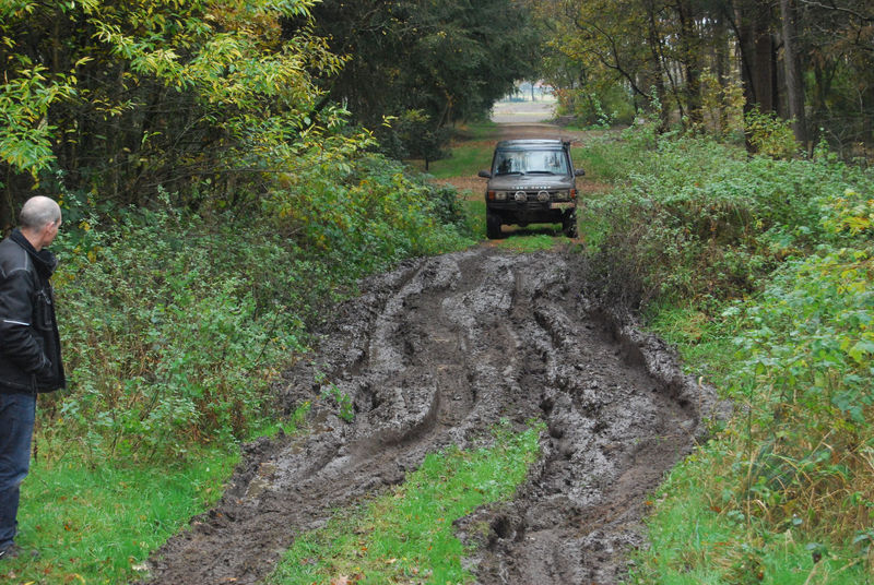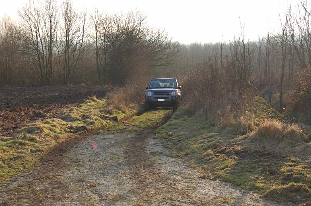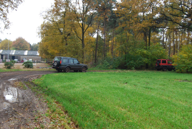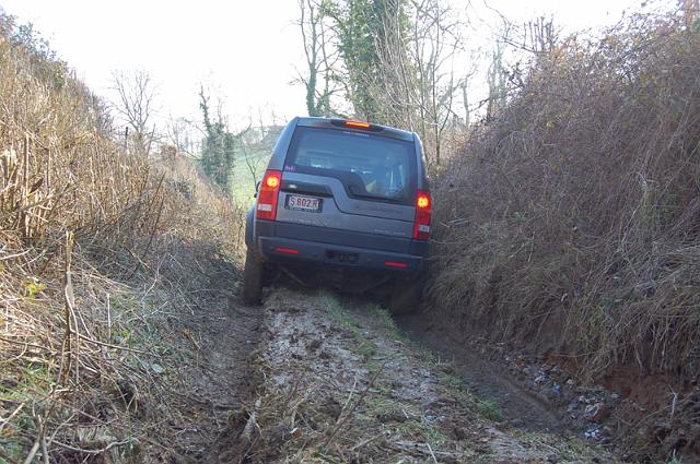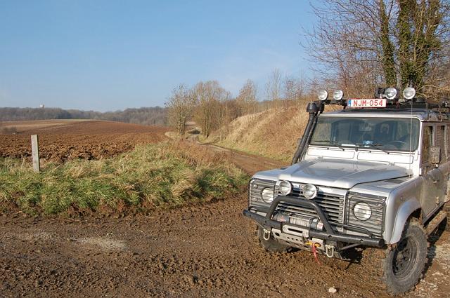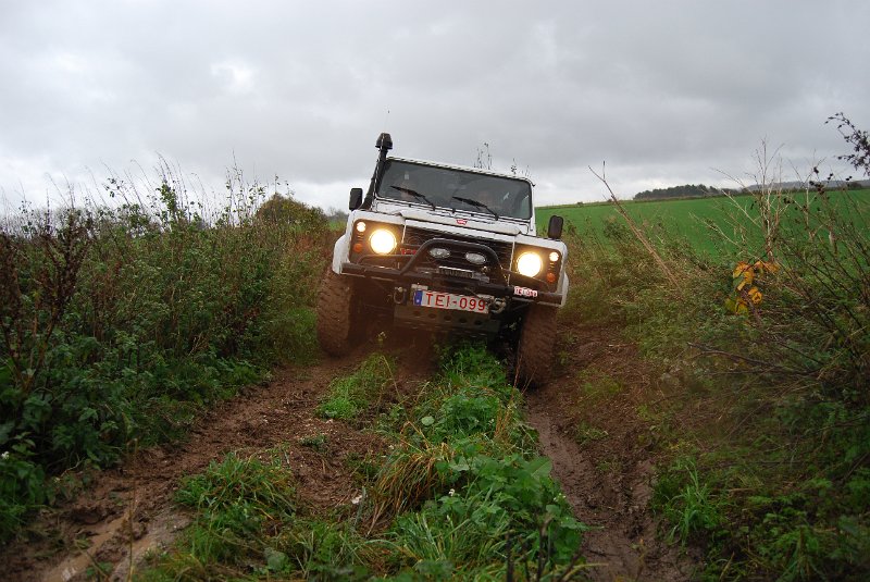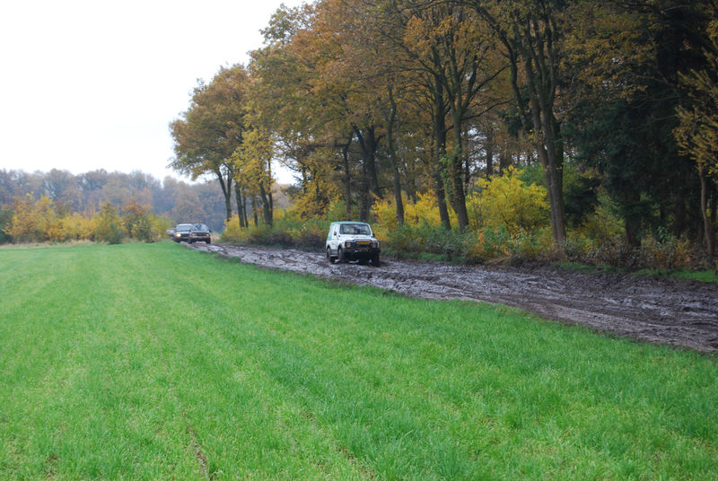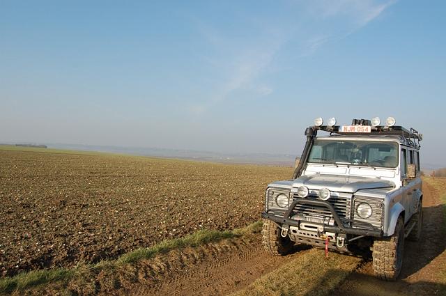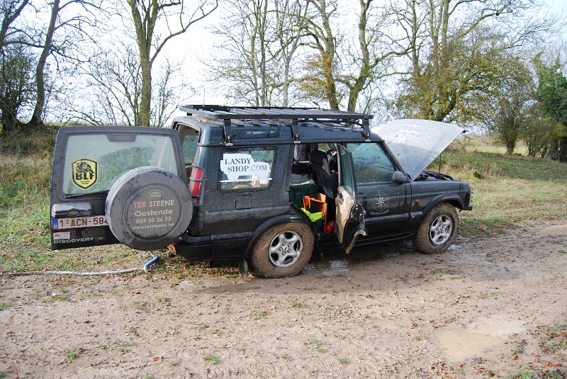 Na de doorwading gaat het verder via bossen en velden. Krasvrij is de rit zeker niet maar het is ook geen wagenbreker. Bij het stukje extreme is de Def90 in staat de bocht te nemen maar door de roofrack in combinatie terug met een lange body, blijft de Disco2 hangen in de bomen en moet ik terugdraaien. Wel eens leuk om te proberen. Het gaat nu verder richting einde en een van de laatste stukken is een grasstrook tussen twee velden. Makkie dus ..... dachten we.