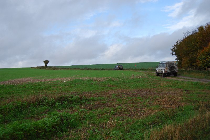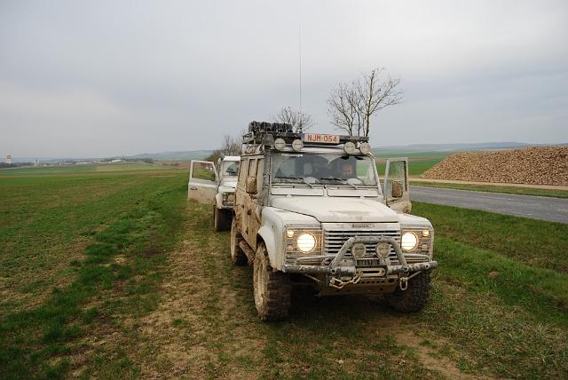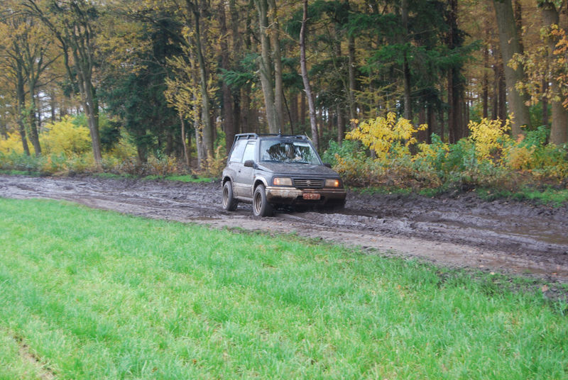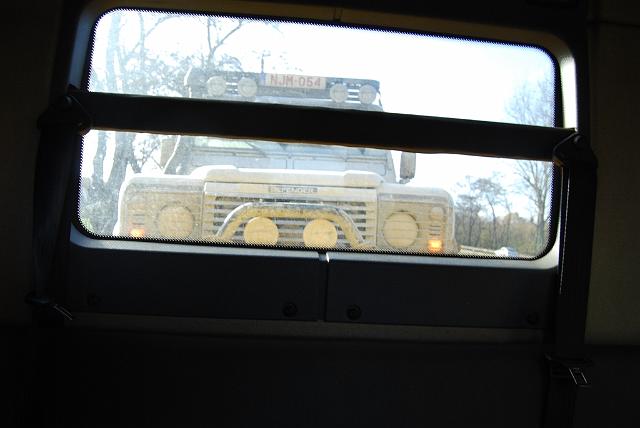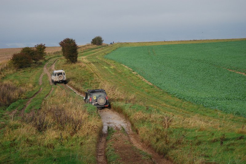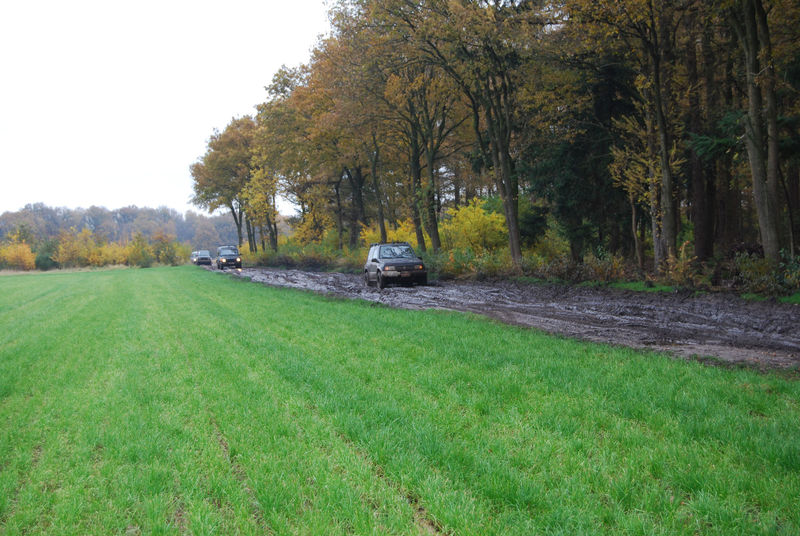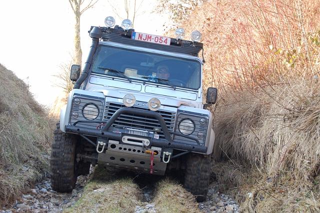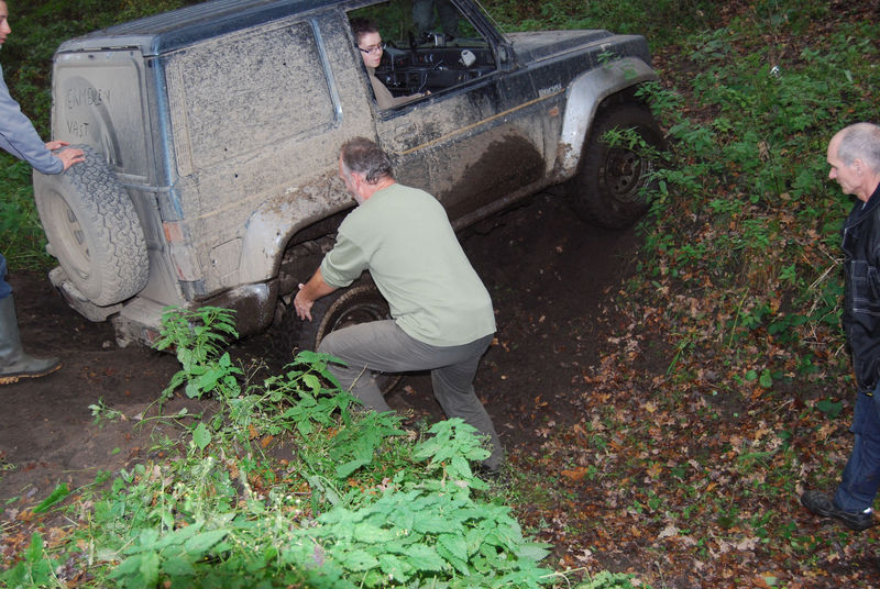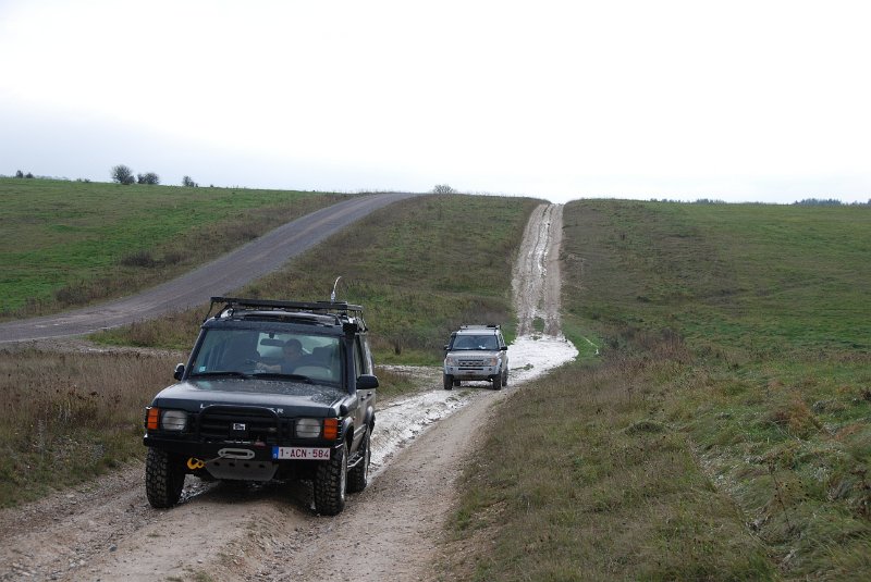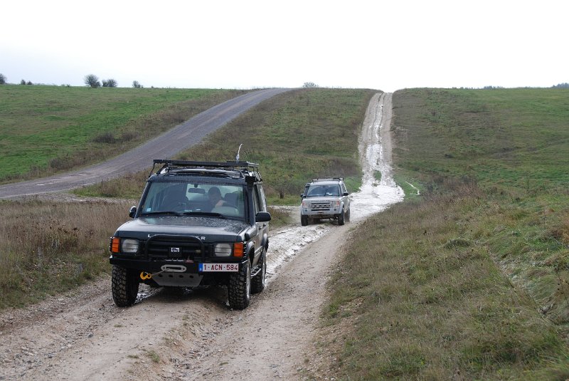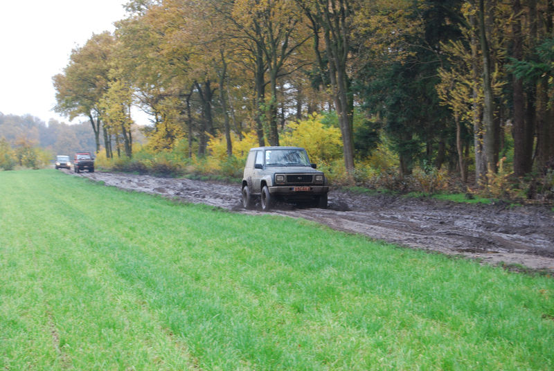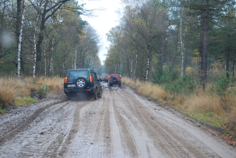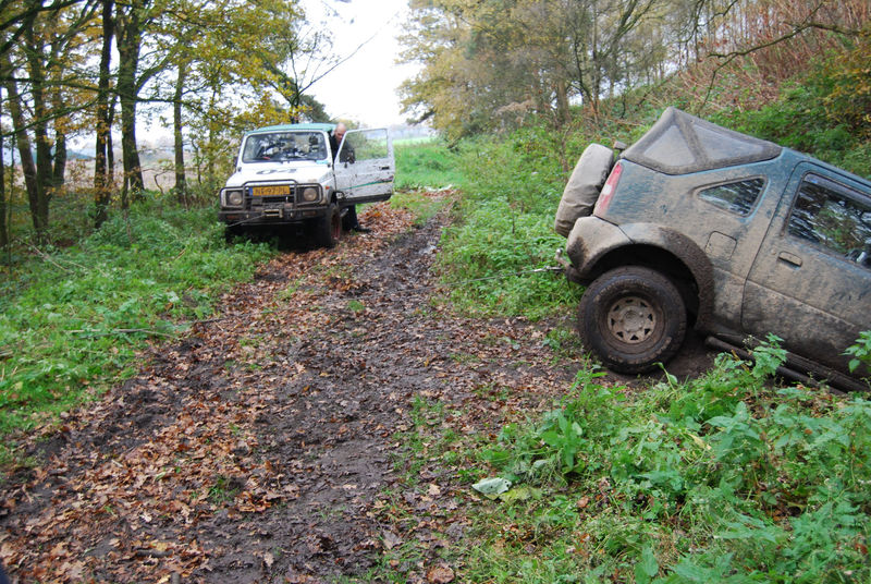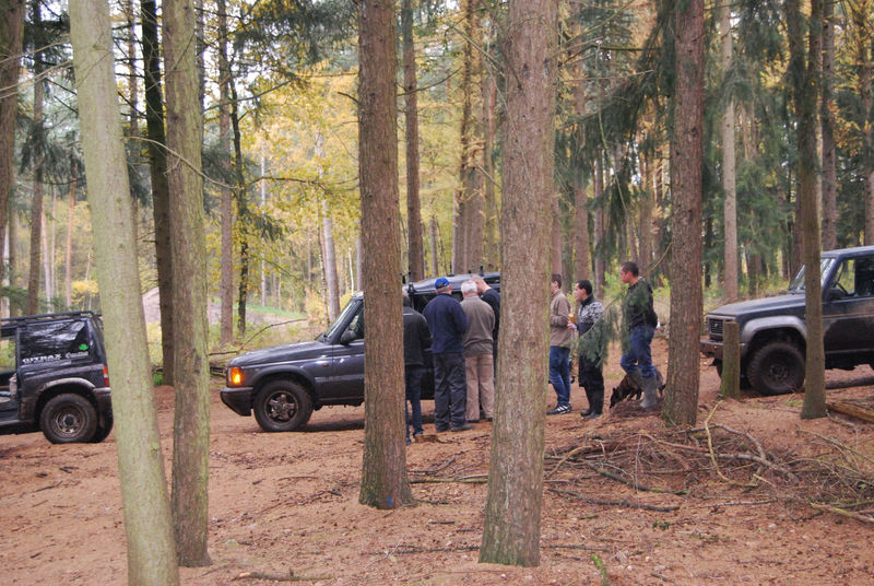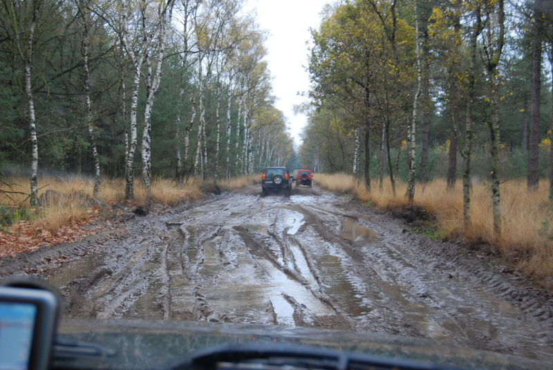 Na de doorwading gaat het verder via bossen en velden. Krasvrij is de rit zeker niet maar het is ook geen wagenbreker. Bij het stukje extreme is de Def90 in staat de bocht te nemen maar door de roofrack in combinatie terug met een lange body, blijft de Disco2 hangen in de bomen en moet ik terugdraaien. Wel eens leuk om te proberen. Het gaat nu verder richting einde en een van de laatste stukken is een grasstrook tussen twee velden. Makkie dus ..... dachten we.
