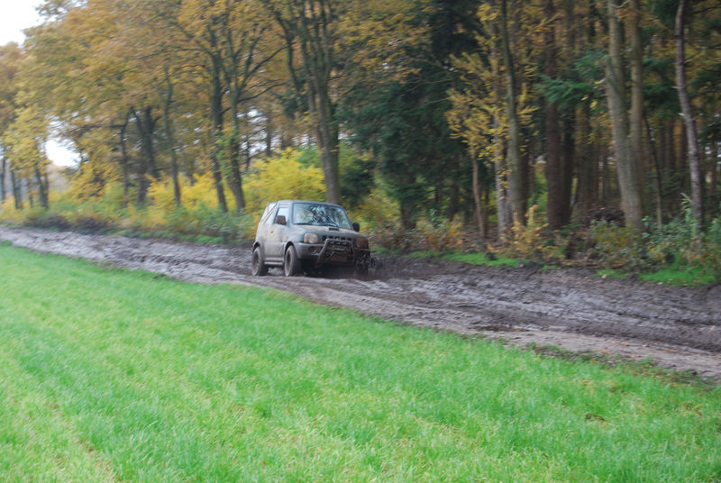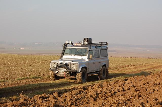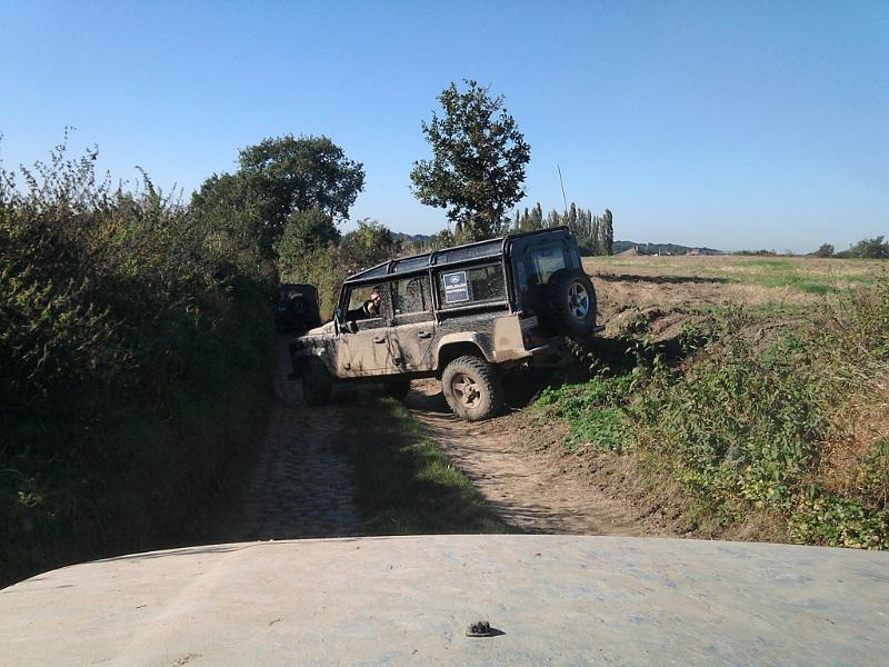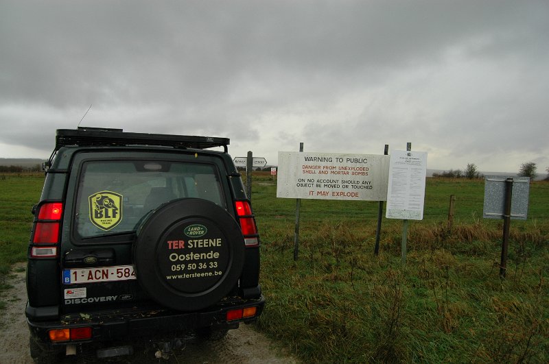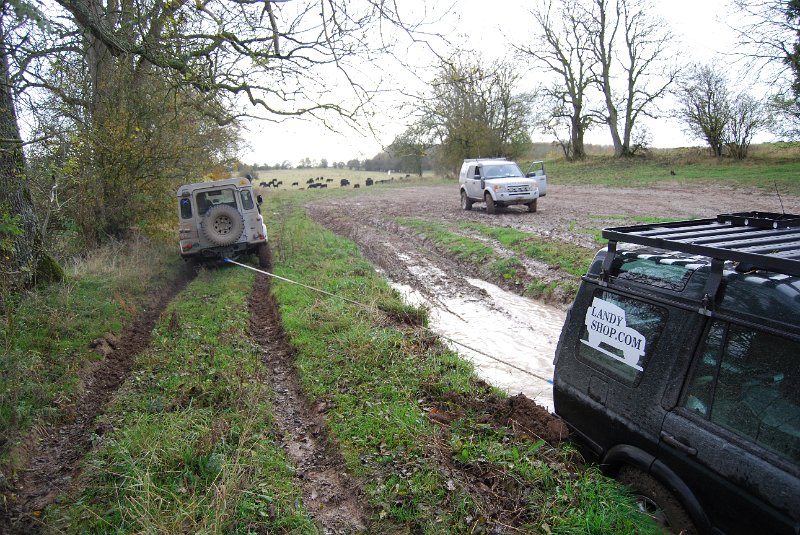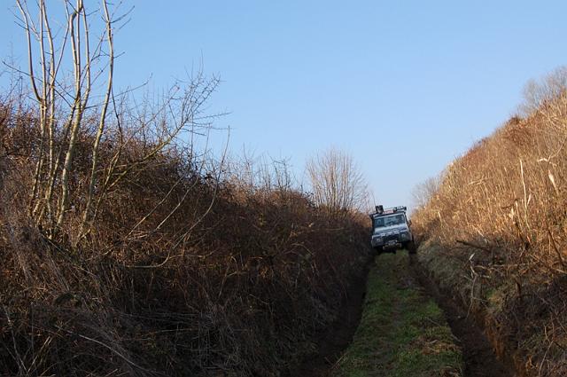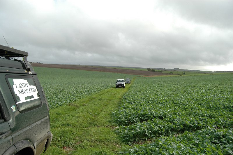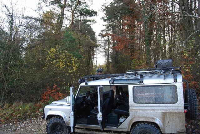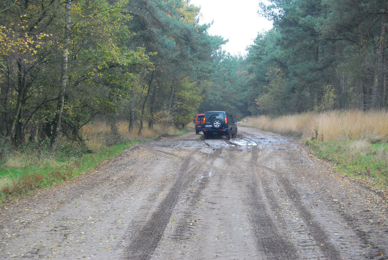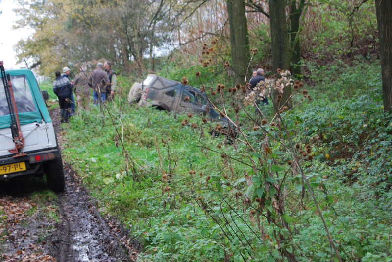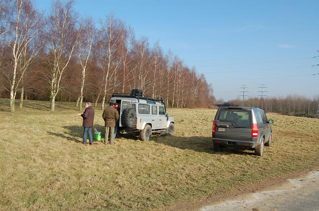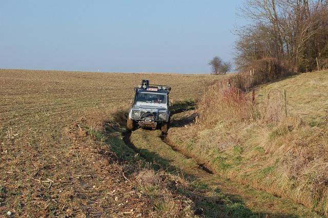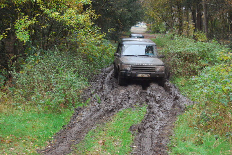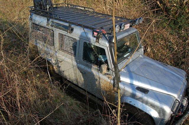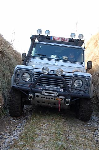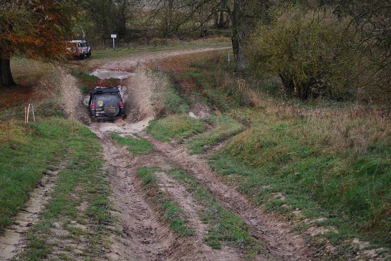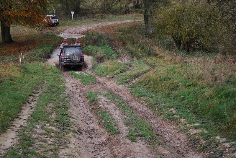 Na de doorwading gaat het verder via bossen en velden. Krasvrij is de rit zeker niet maar het is ook geen wagenbreker. Bij het stukje extreme is de Def90 in staat de bocht te nemen maar door de roofrack in combinatie terug met een lange body, blijft de Disco2 hangen in de bomen en moet ik terugdraaien. Wel eens leuk om te proberen. Het gaat nu verder richting einde en een van de laatste stukken is een grasstrook tussen twee velden. Makkie dus ..... dachten we.