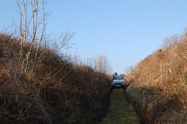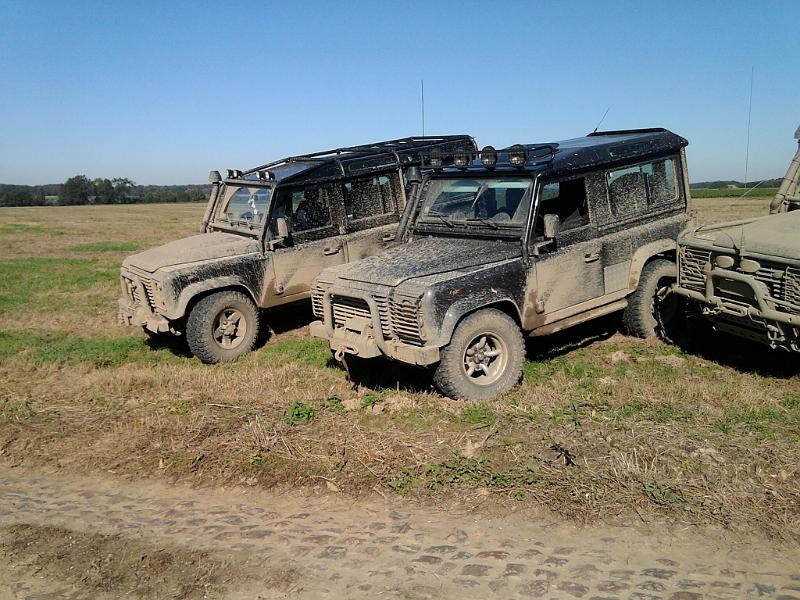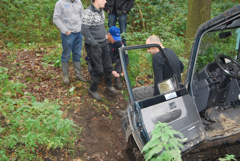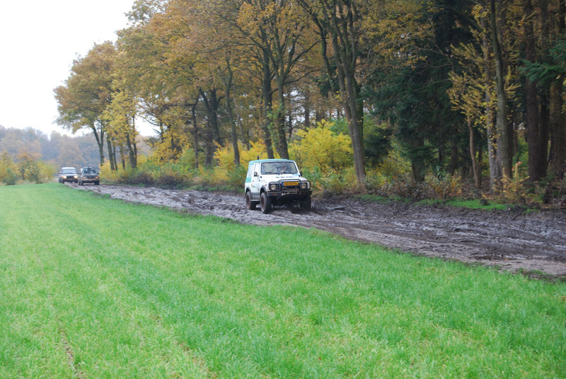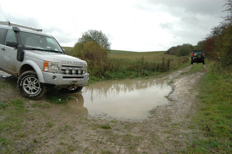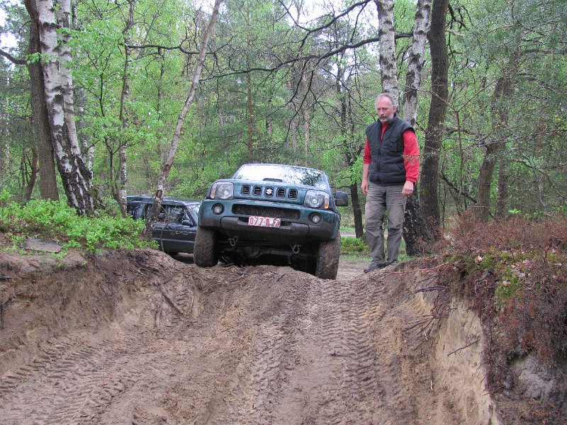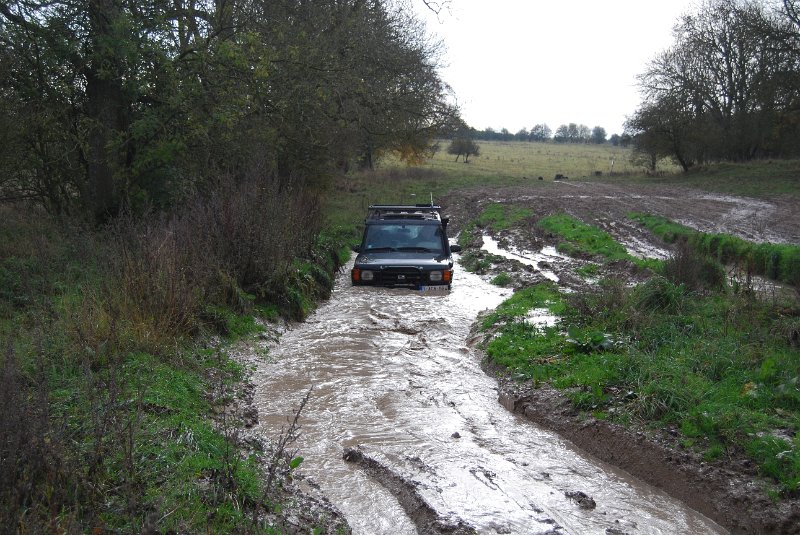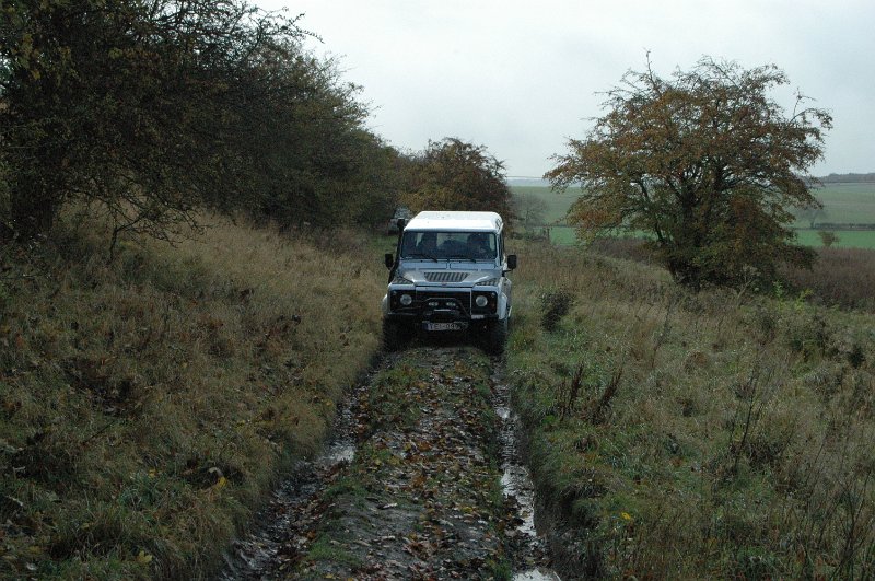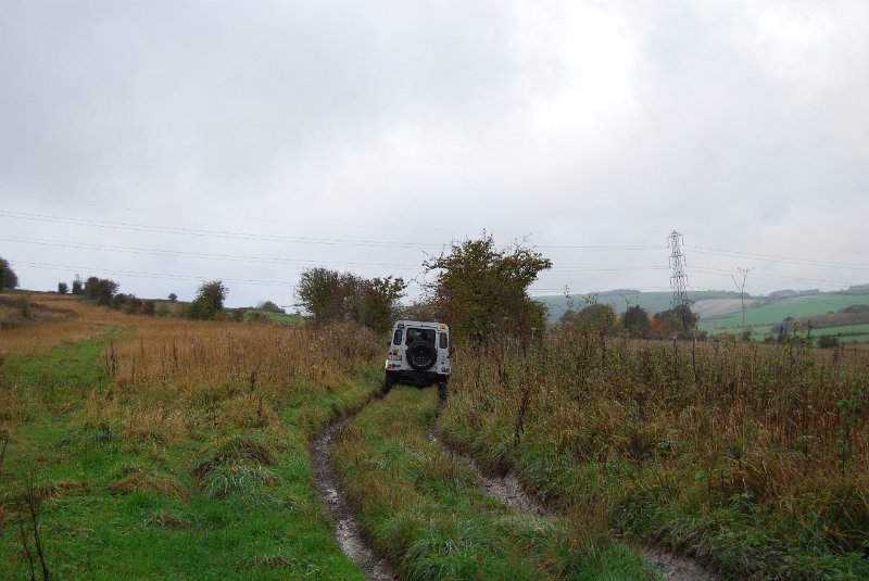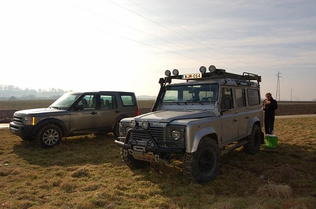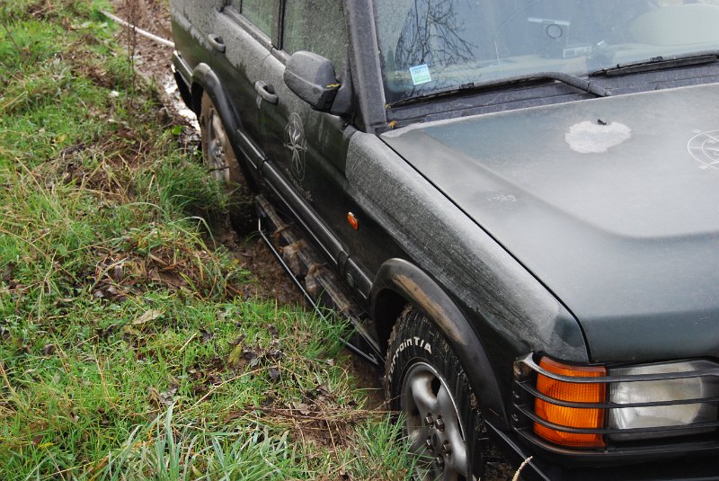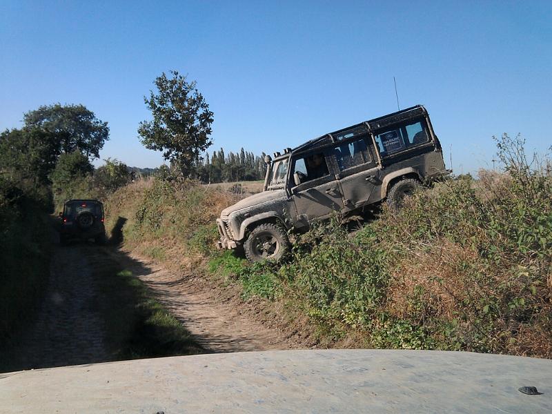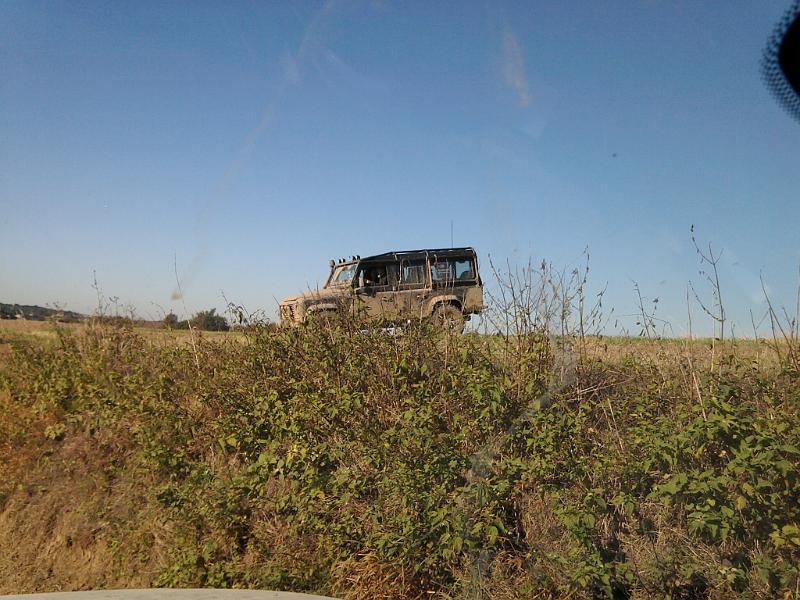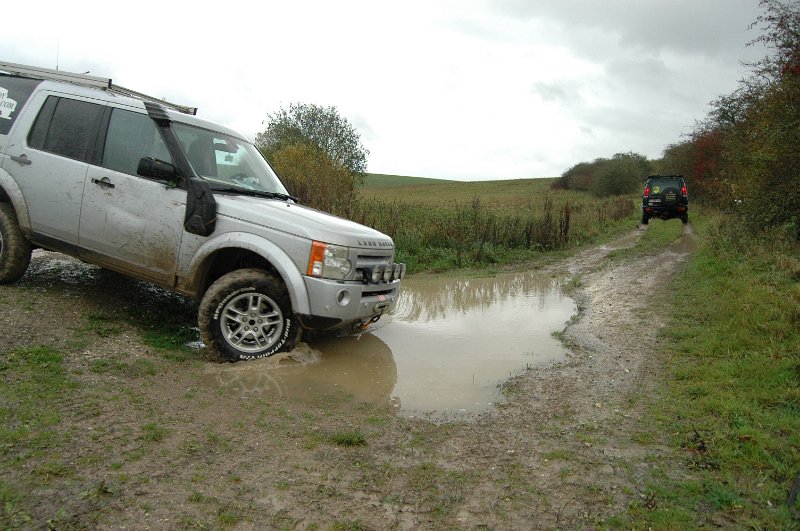 Na de doorwading gaat het verder via bossen en velden. Krasvrij is de rit zeker niet maar het is ook geen wagenbreker. Bij het stukje extreme is de Def90 in staat de bocht te nemen maar door de roofrack in combinatie terug met een lange body, blijft de Disco2 hangen in de bomen en moet ik terugdraaien. Wel eens leuk om te proberen. Het gaat nu verder richting einde en een van de laatste stukken is een grasstrook tussen twee velden. Makkie dus ..... dachten we.