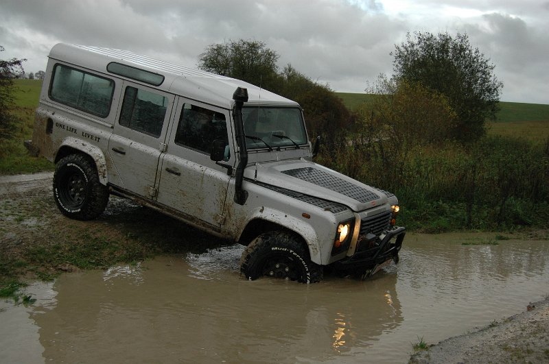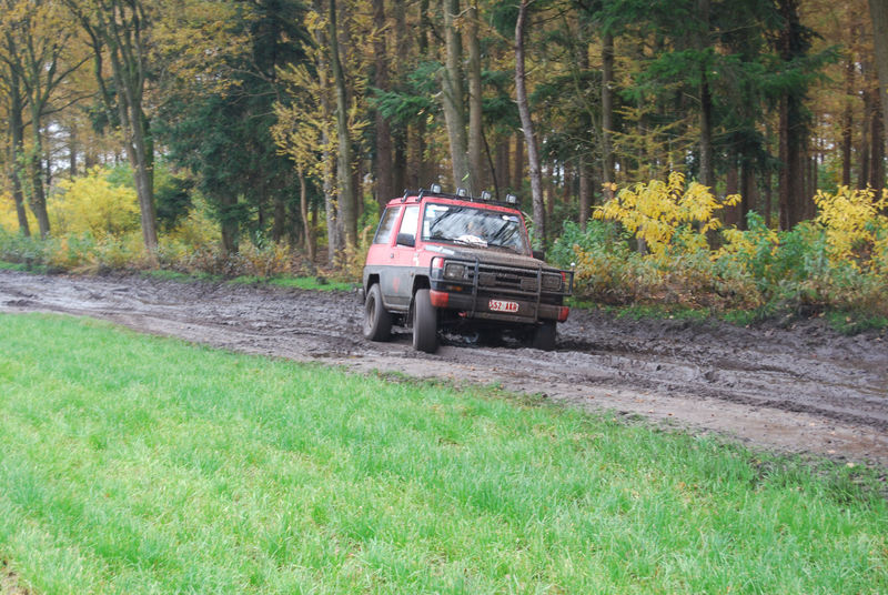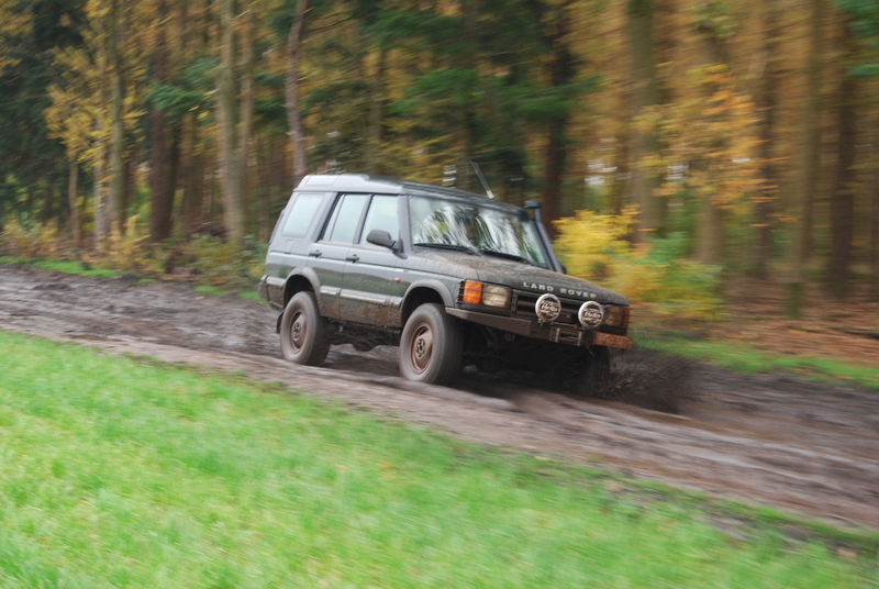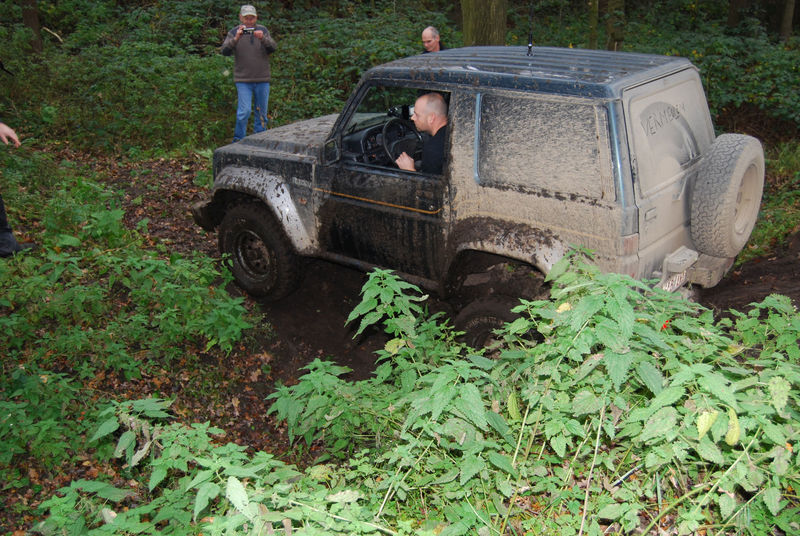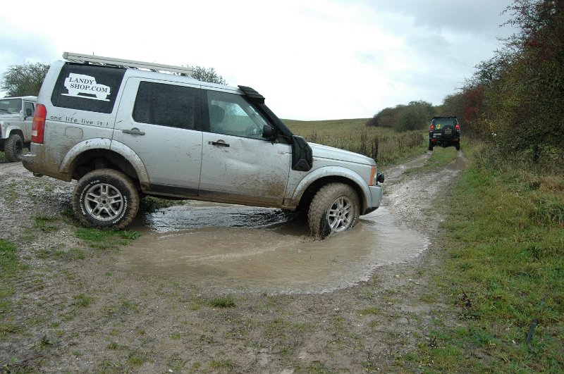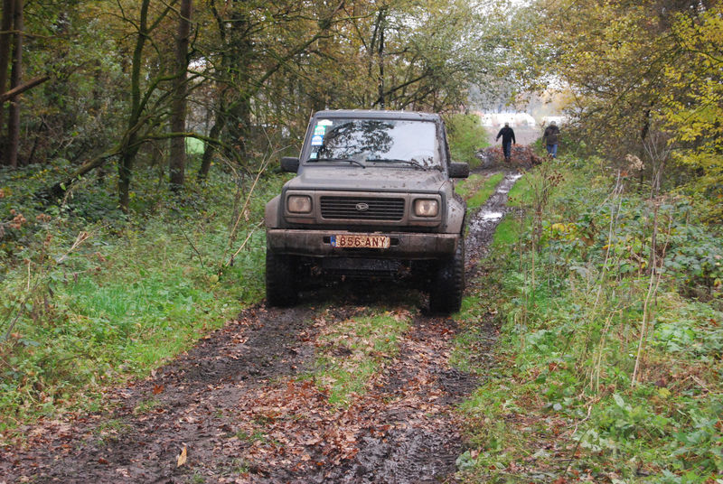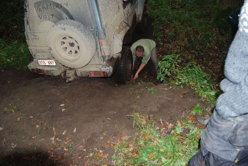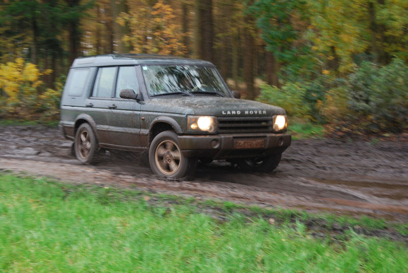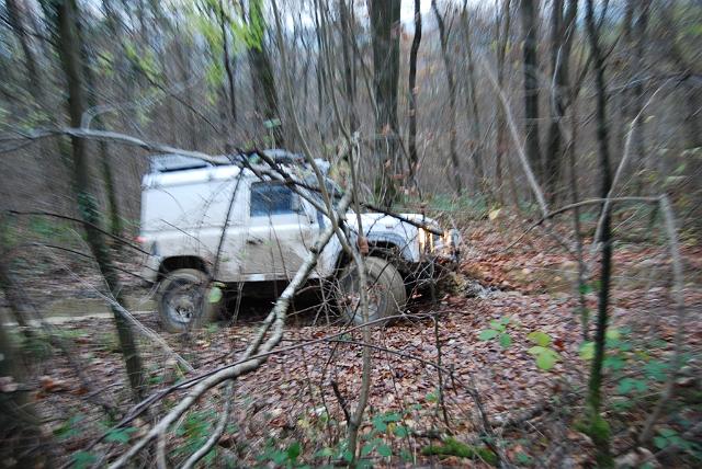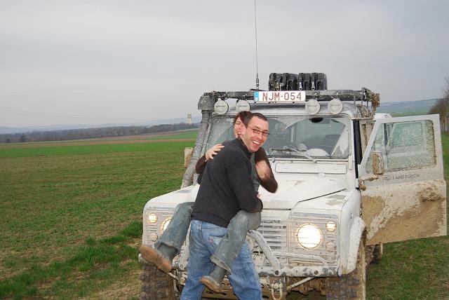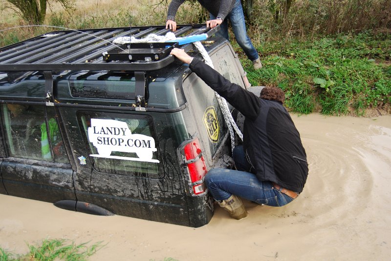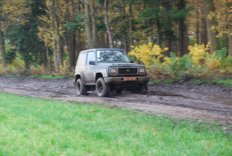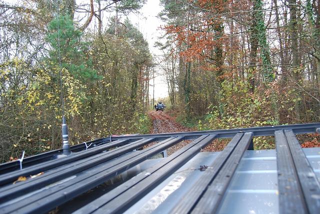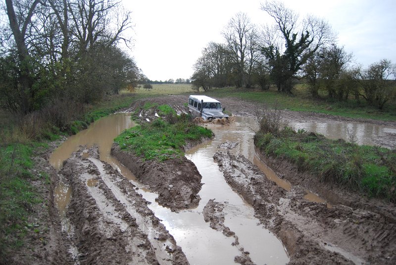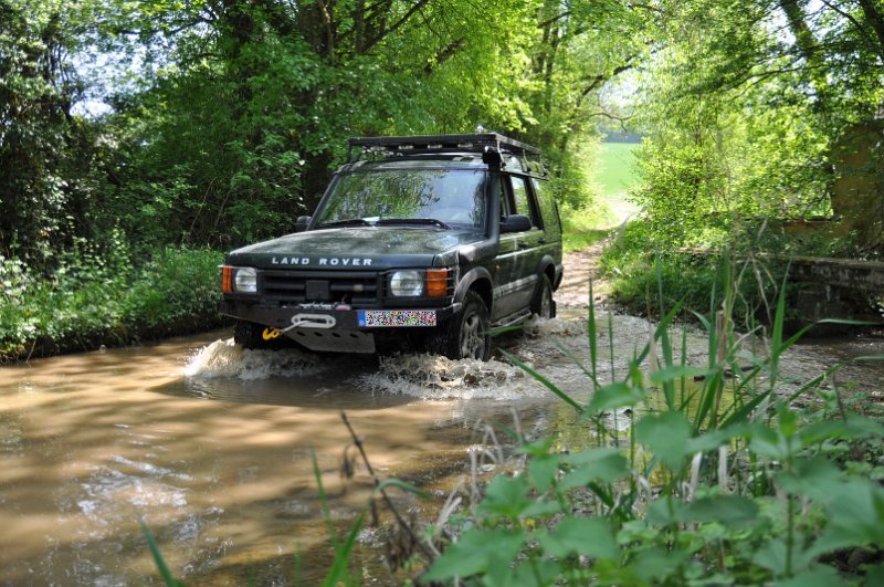 Na de doorwading gaat het verder via bossen en velden. Krasvrij is de rit zeker niet maar het is ook geen wagenbreker. Bij het stukje extreme is de Def90 in staat de bocht te nemen maar door de roofrack in combinatie terug met een lange body, blijft de Disco2 hangen in de bomen en moet ik terugdraaien. Wel eens leuk om te proberen. Het gaat nu verder richting einde en een van de laatste stukken is een grasstrook tussen twee velden. Makkie dus ..... dachten we.