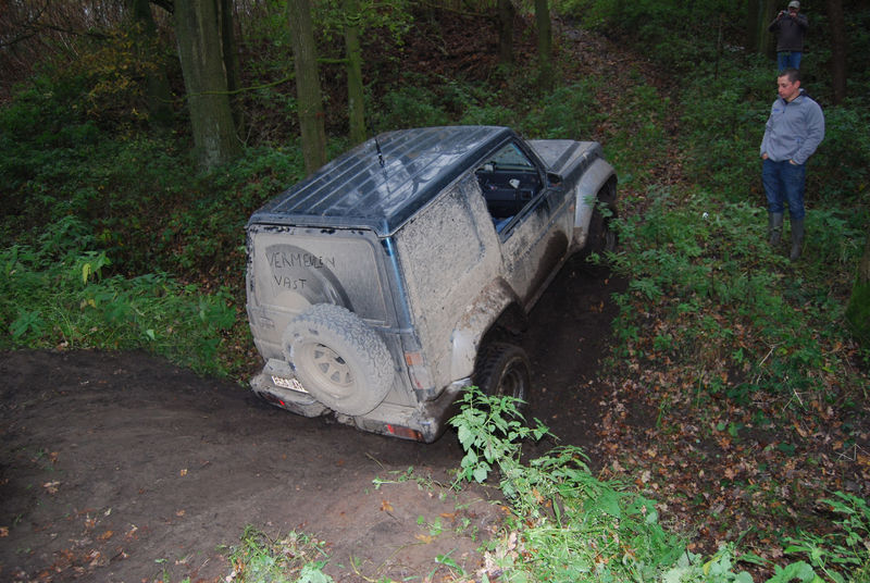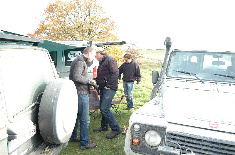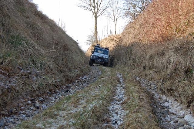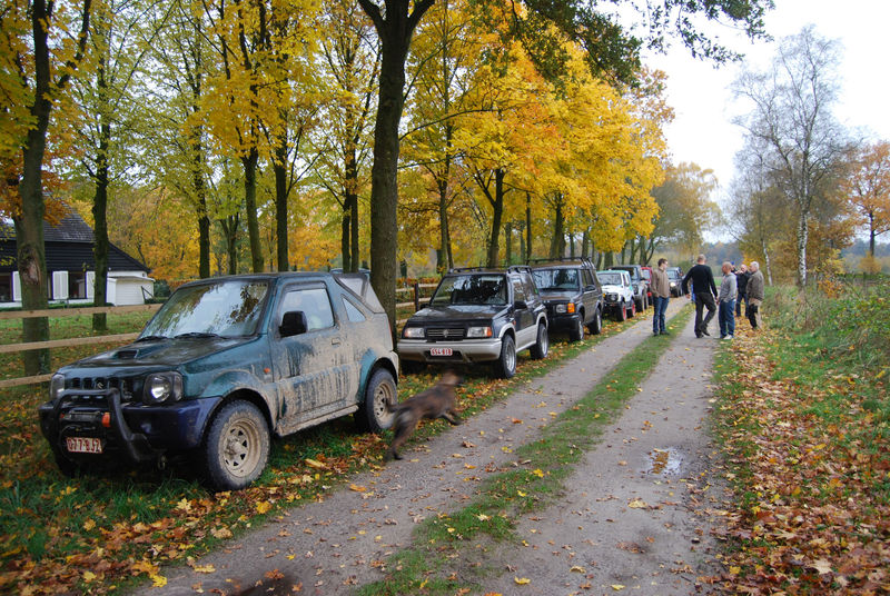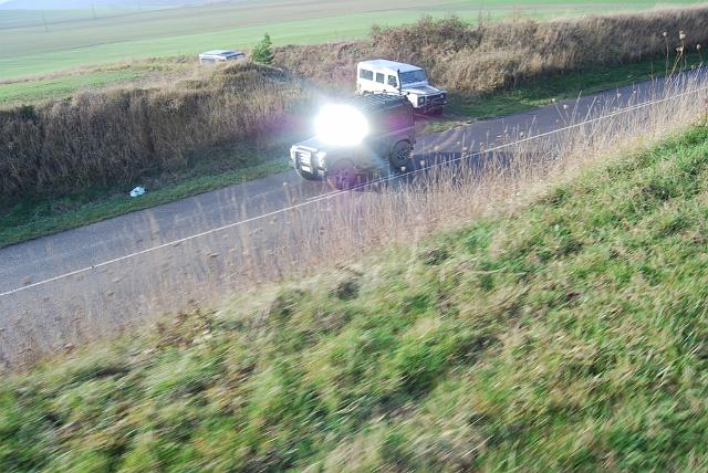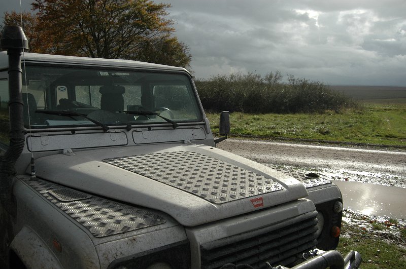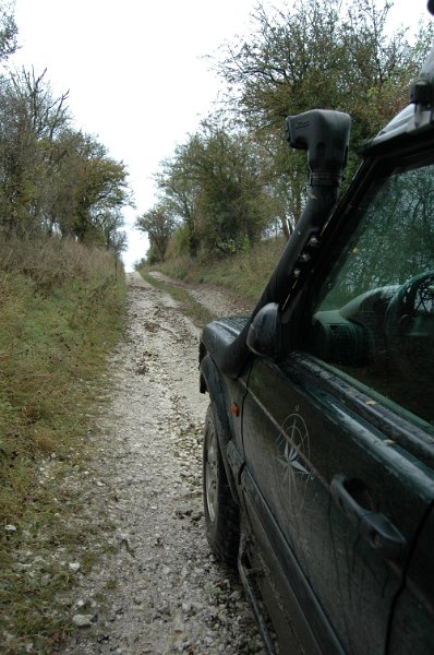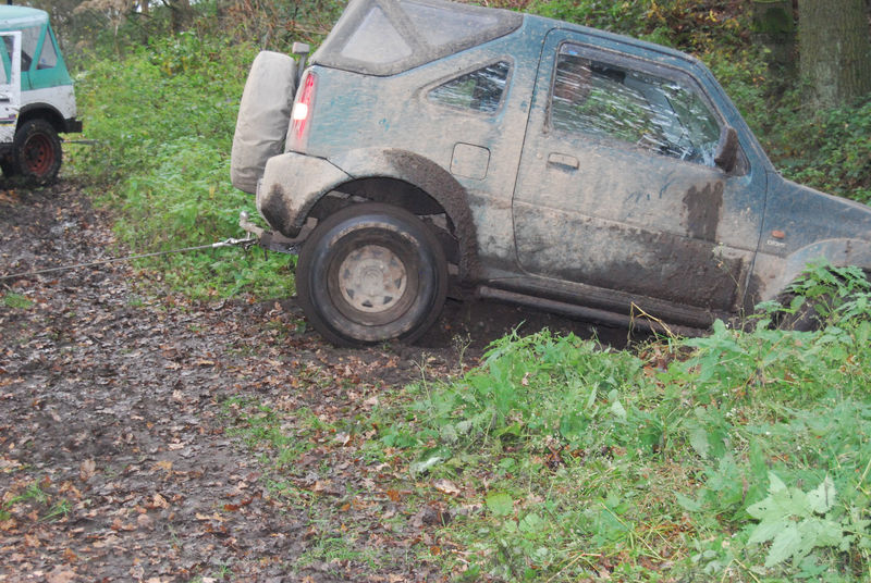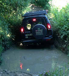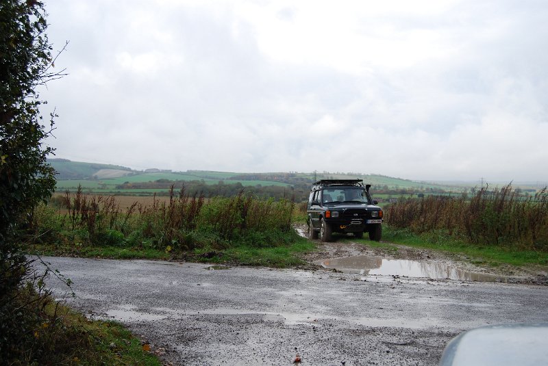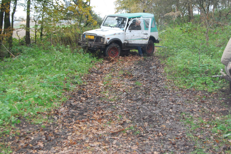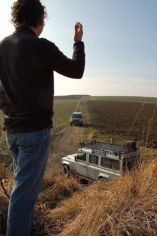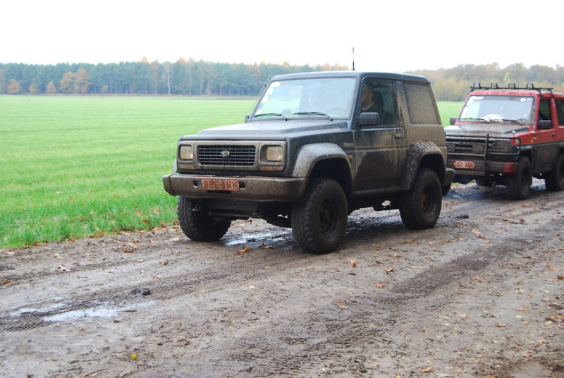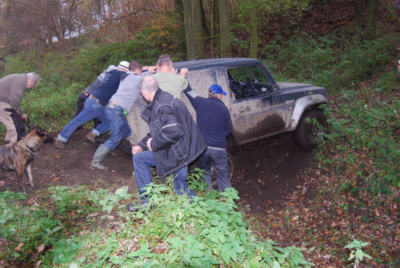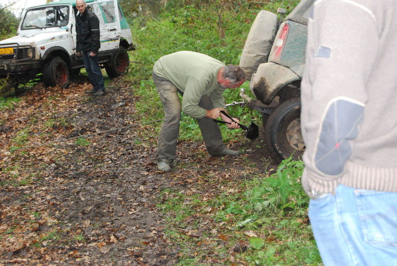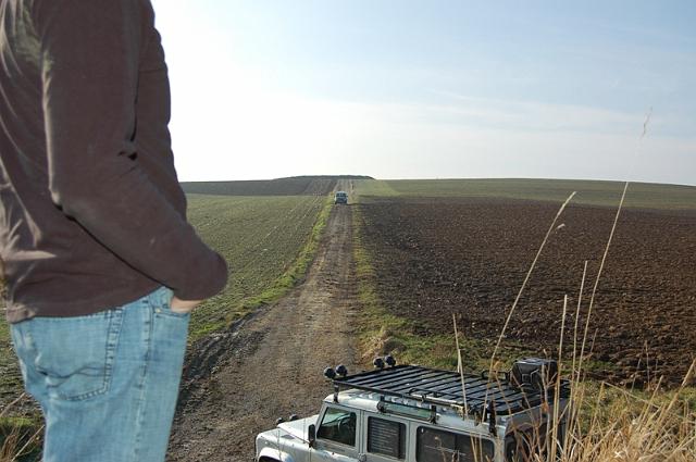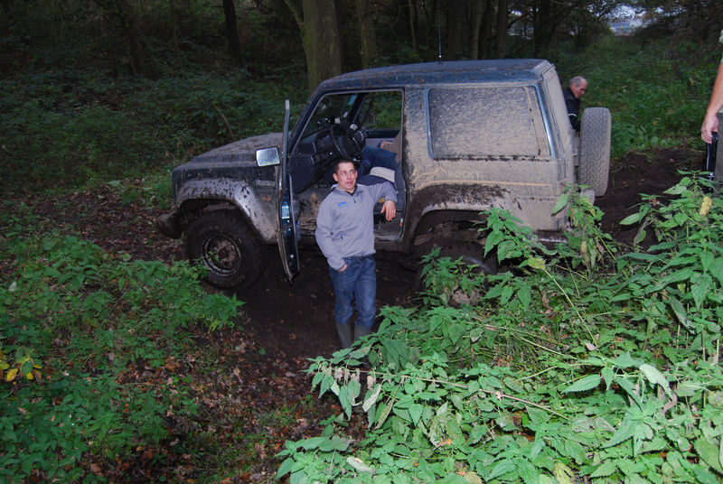Na de doorwading gaat het verder via bossen en velden. Krasvrij is de rit zeker niet maar het is ook geen wagenbreker. Bij het stukje extreme is de Def90 in staat de bocht te nemen maar door de roofrack in combinatie terug met een lange body, blijft de Disco2 hangen in de bomen en moet ik terugdraaien. Wel eens leuk om te proberen. Het gaat nu verder richting einde en een van de laatste stukken is een grasstrook tussen twee velden. Makkie dus ..... dachten we.