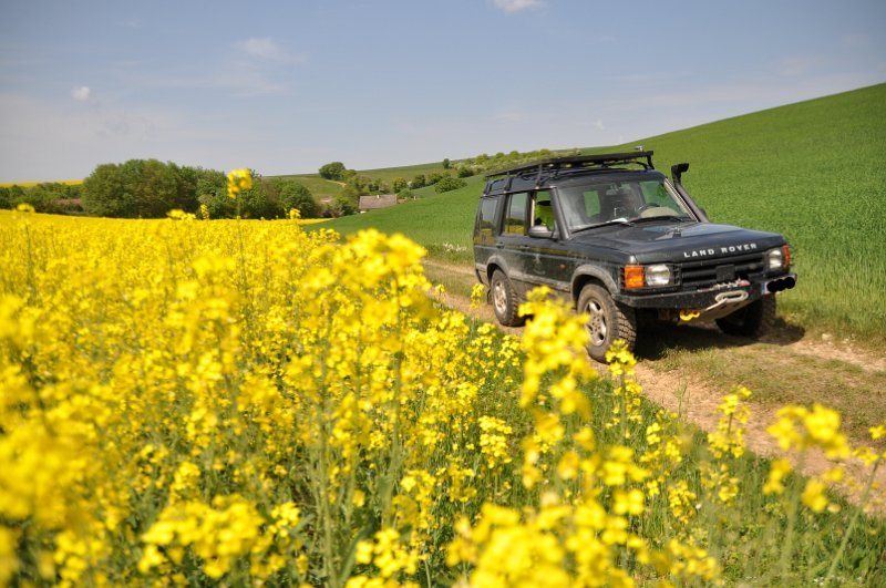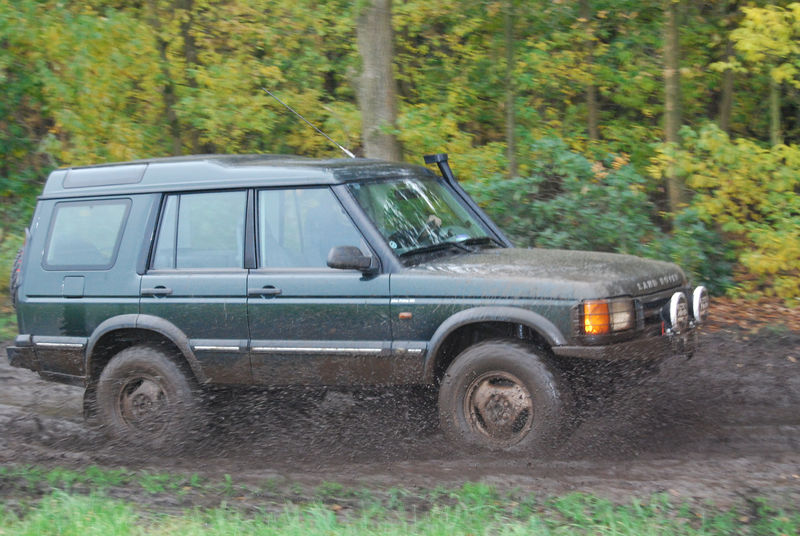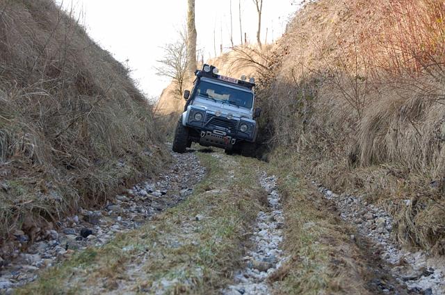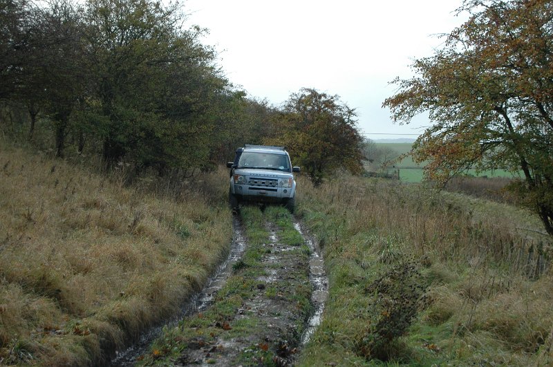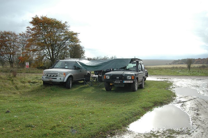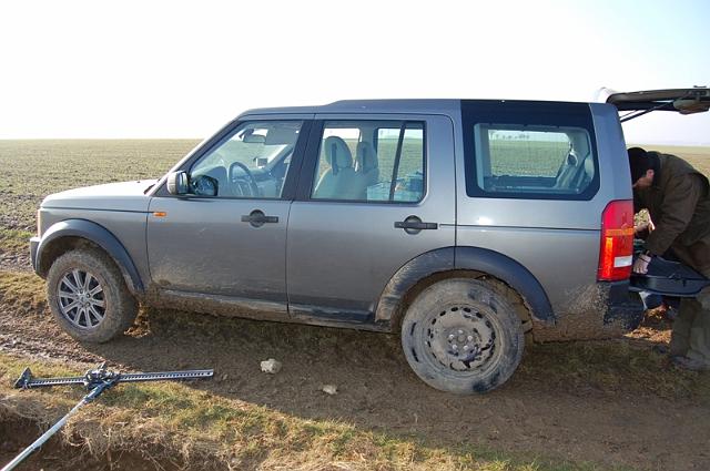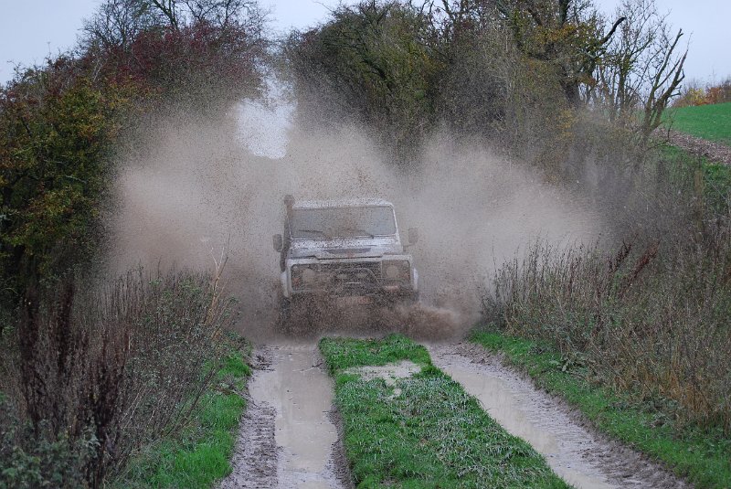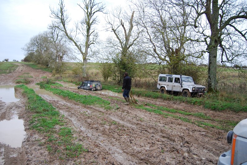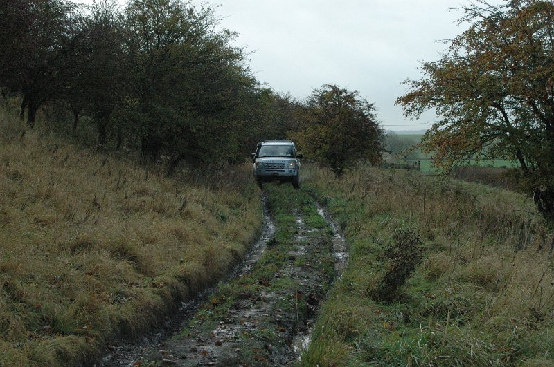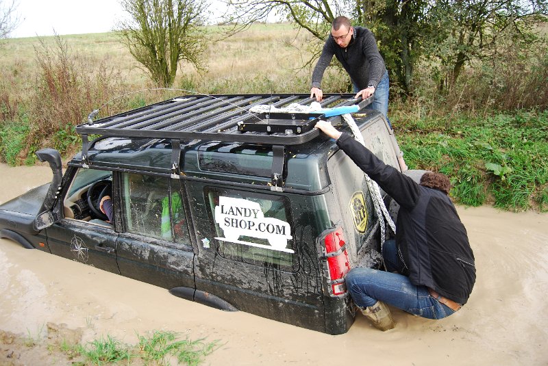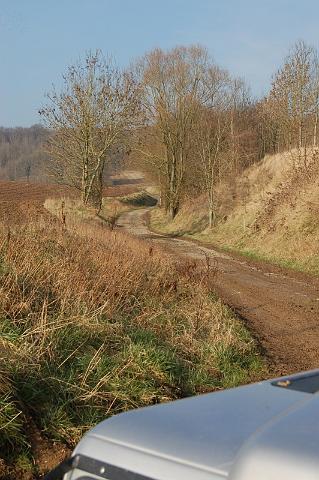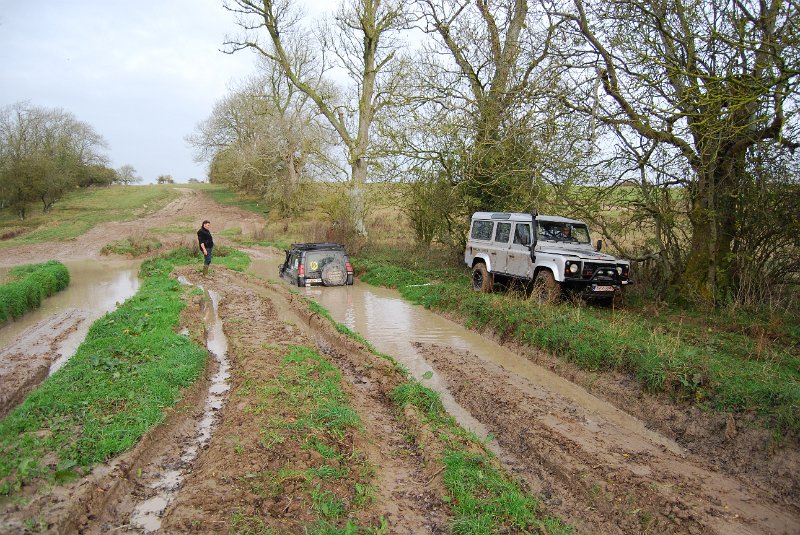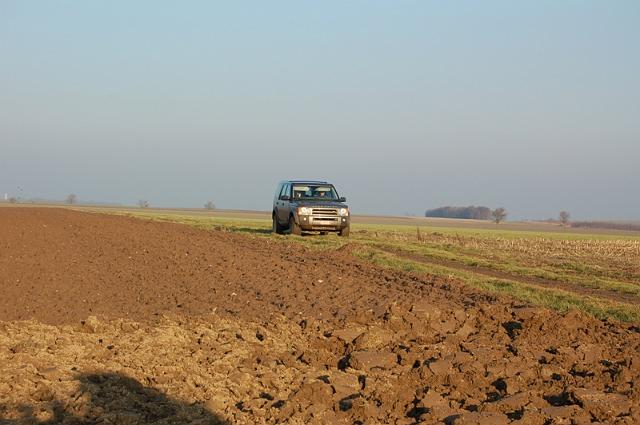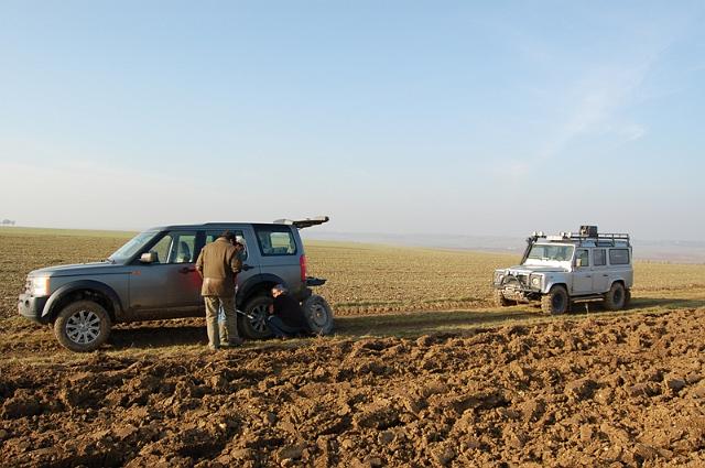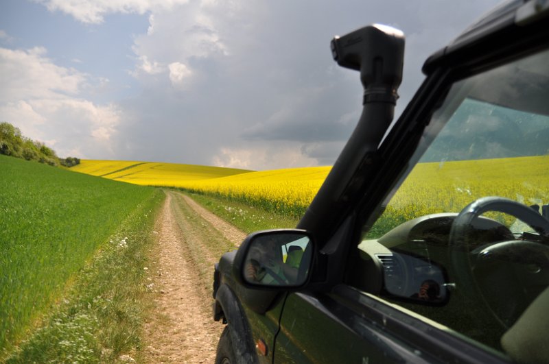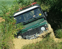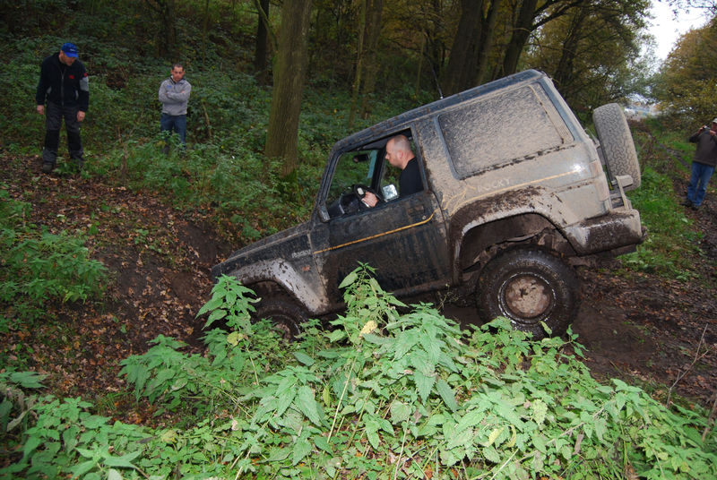 Na de doorwading gaat het verder via bossen en velden. Krasvrij is de rit zeker niet maar het is ook geen wagenbreker. Bij het stukje extreme is de Def90 in staat de bocht te nemen maar door de roofrack in combinatie terug met een lange body, blijft de Disco2 hangen in de bomen en moet ik terugdraaien. Wel eens leuk om te proberen. Het gaat nu verder richting einde en een van de laatste stukken is een grasstrook tussen twee velden. Makkie dus ..... dachten we.
