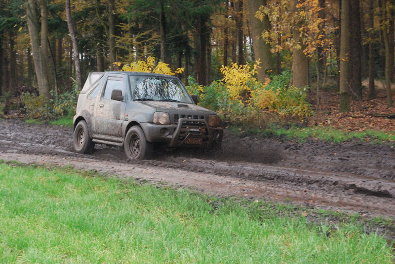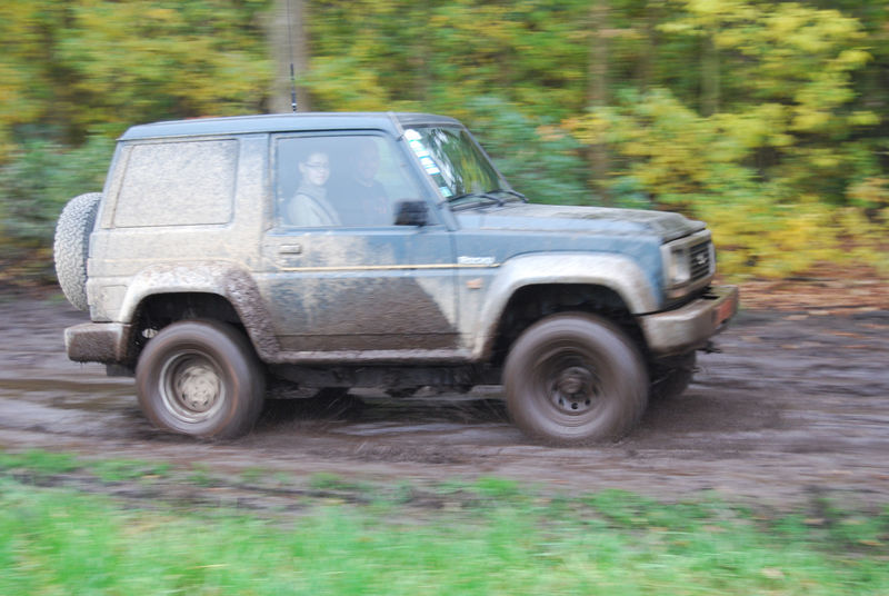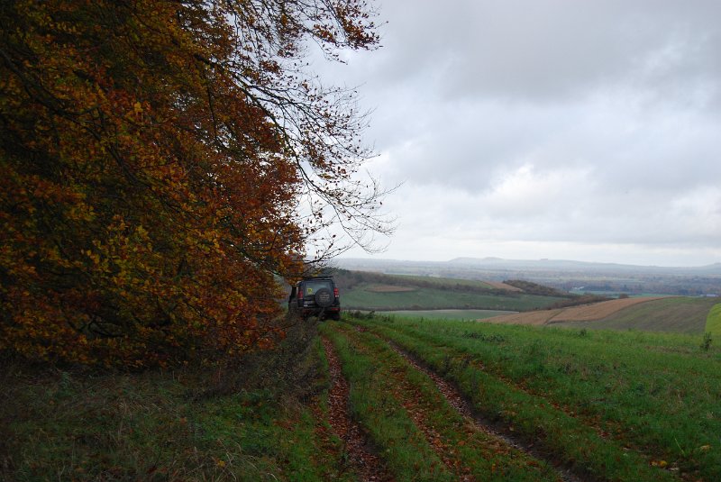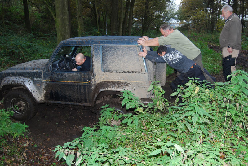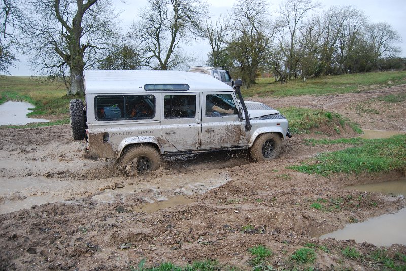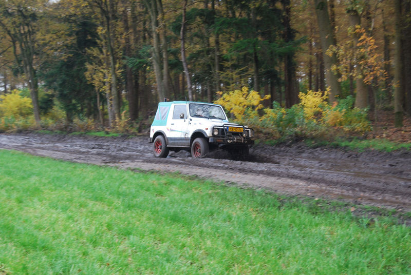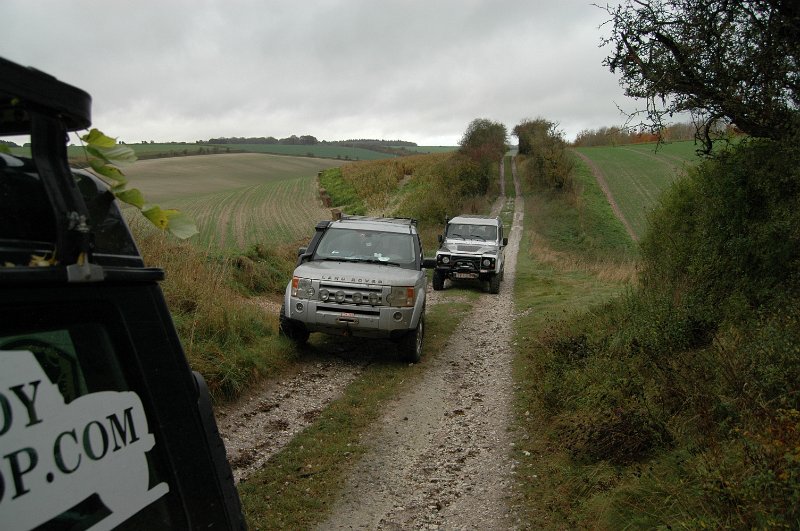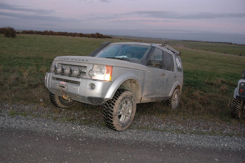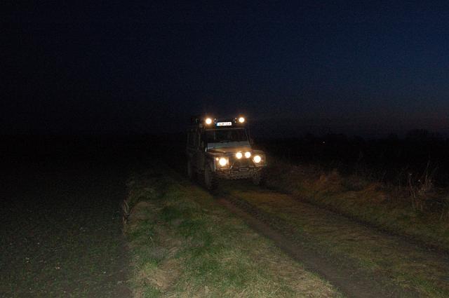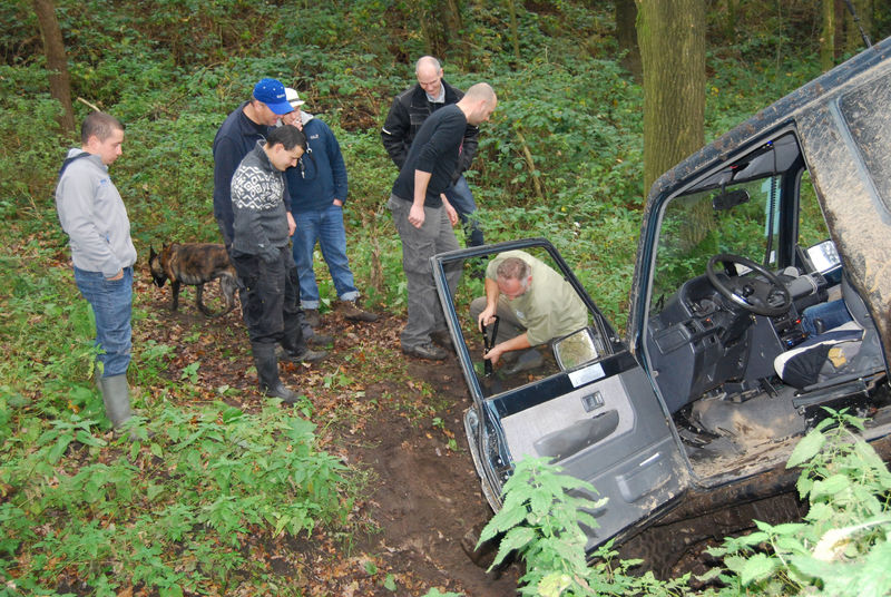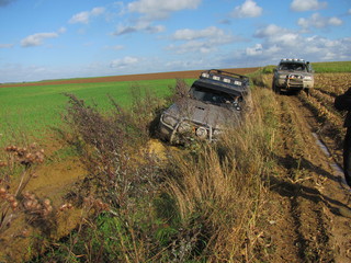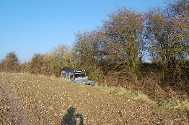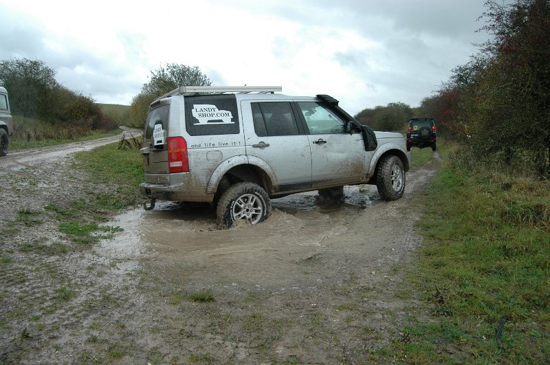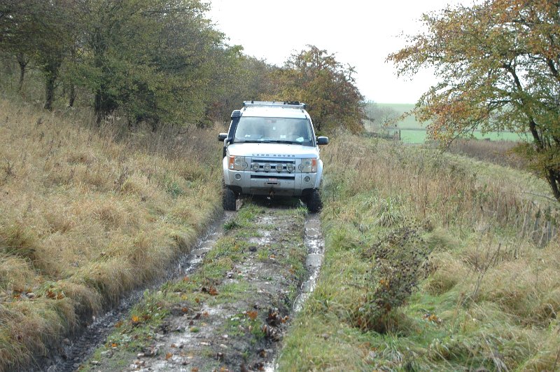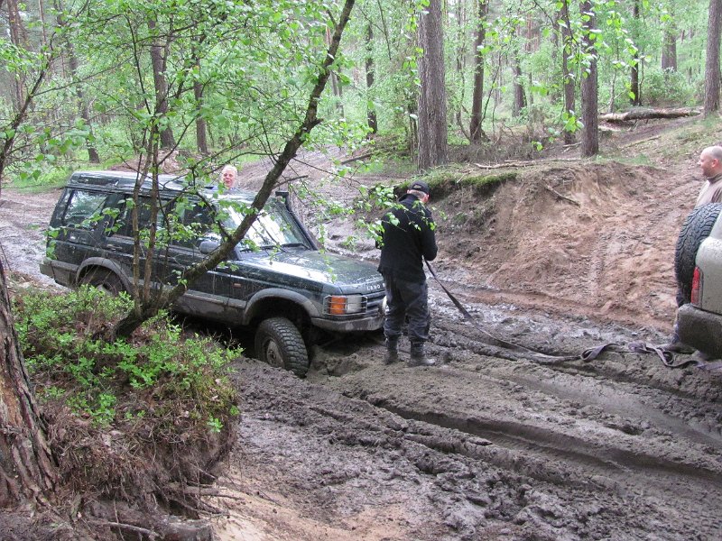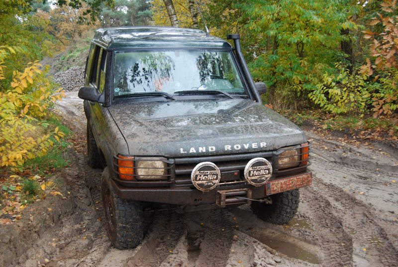 Na de doorwading gaat het verder via bossen en velden. Krasvrij is de rit zeker niet maar het is ook geen wagenbreker. Bij het stukje extreme is de Def90 in staat de bocht te nemen maar door de roofrack in combinatie terug met een lange body, blijft de Disco2 hangen in de bomen en moet ik terugdraaien. Wel eens leuk om te proberen. Het gaat nu verder richting einde en een van de laatste stukken is een grasstrook tussen twee velden. Makkie dus ..... dachten we.