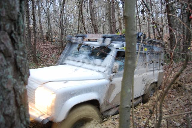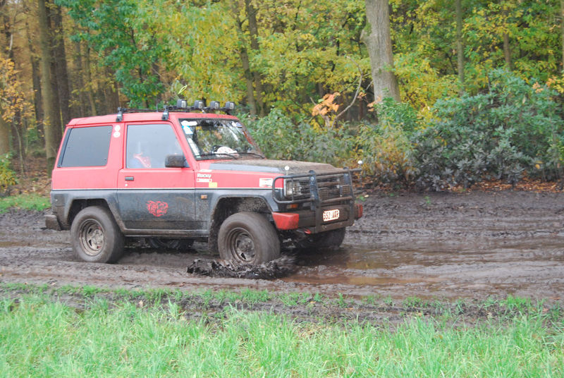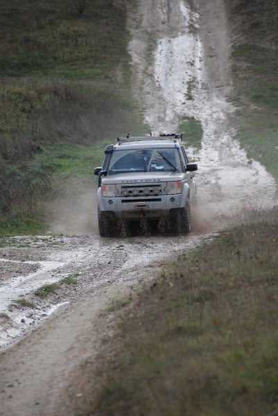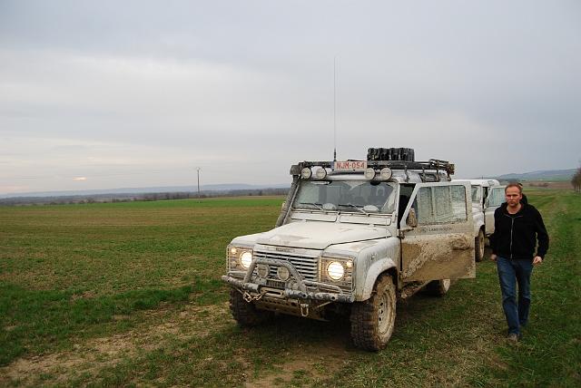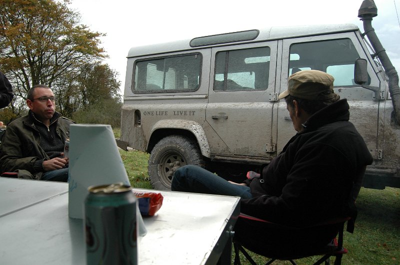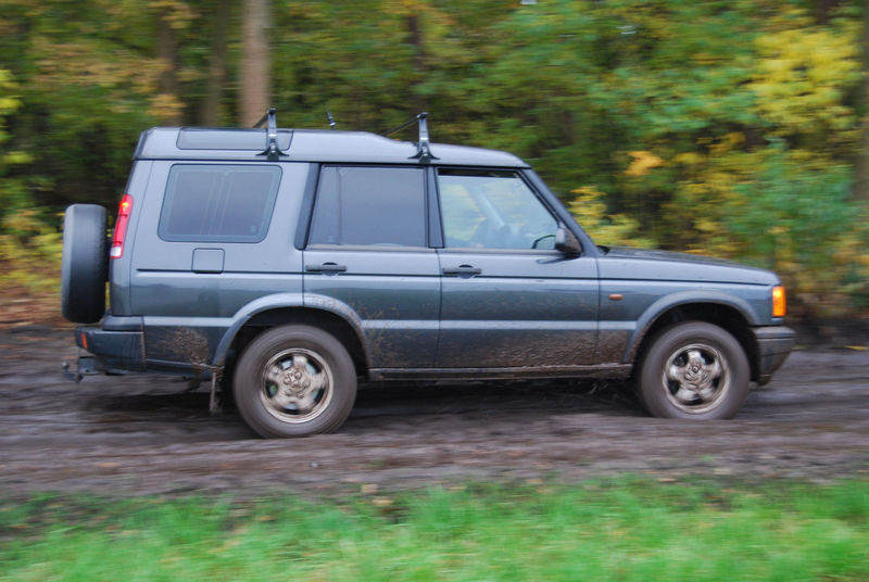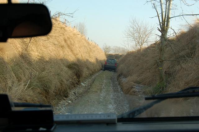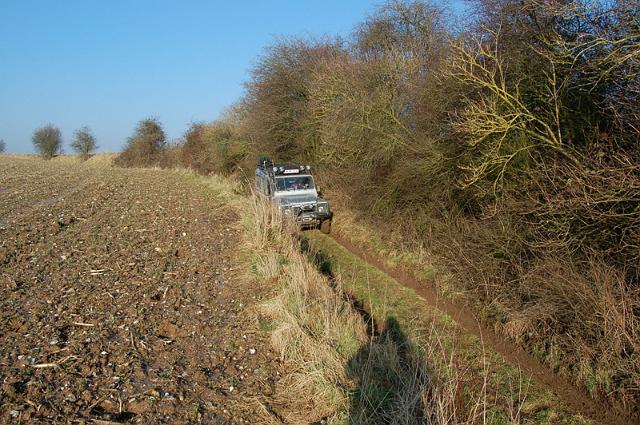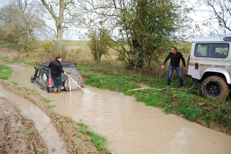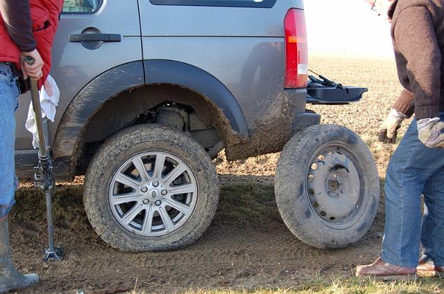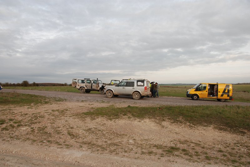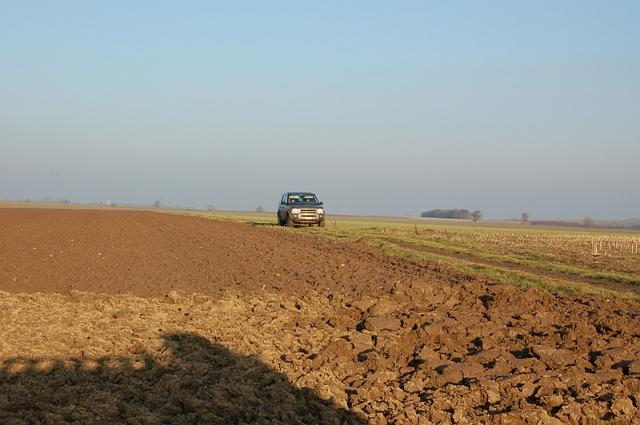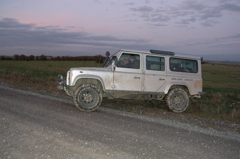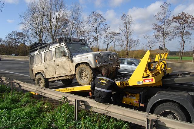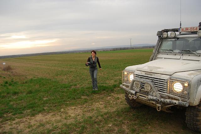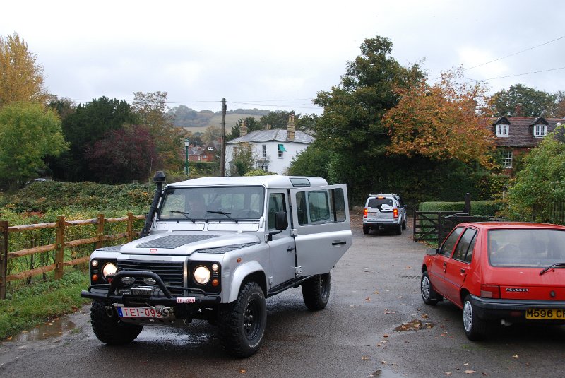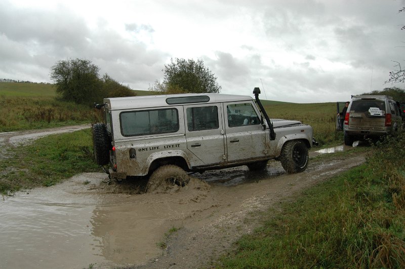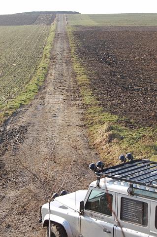 Na de doorwading gaat het verder via bossen en velden. Krasvrij is de rit zeker niet maar het is ook geen wagenbreker. Bij het stukje extreme is de Def90 in staat de bocht te nemen maar door de roofrack in combinatie terug met een lange body, blijft de Disco2 hangen in de bomen en moet ik terugdraaien. Wel eens leuk om te proberen. Het gaat nu verder richting einde en een van de laatste stukken is een grasstrook tussen twee velden. Makkie dus ..... dachten we.
